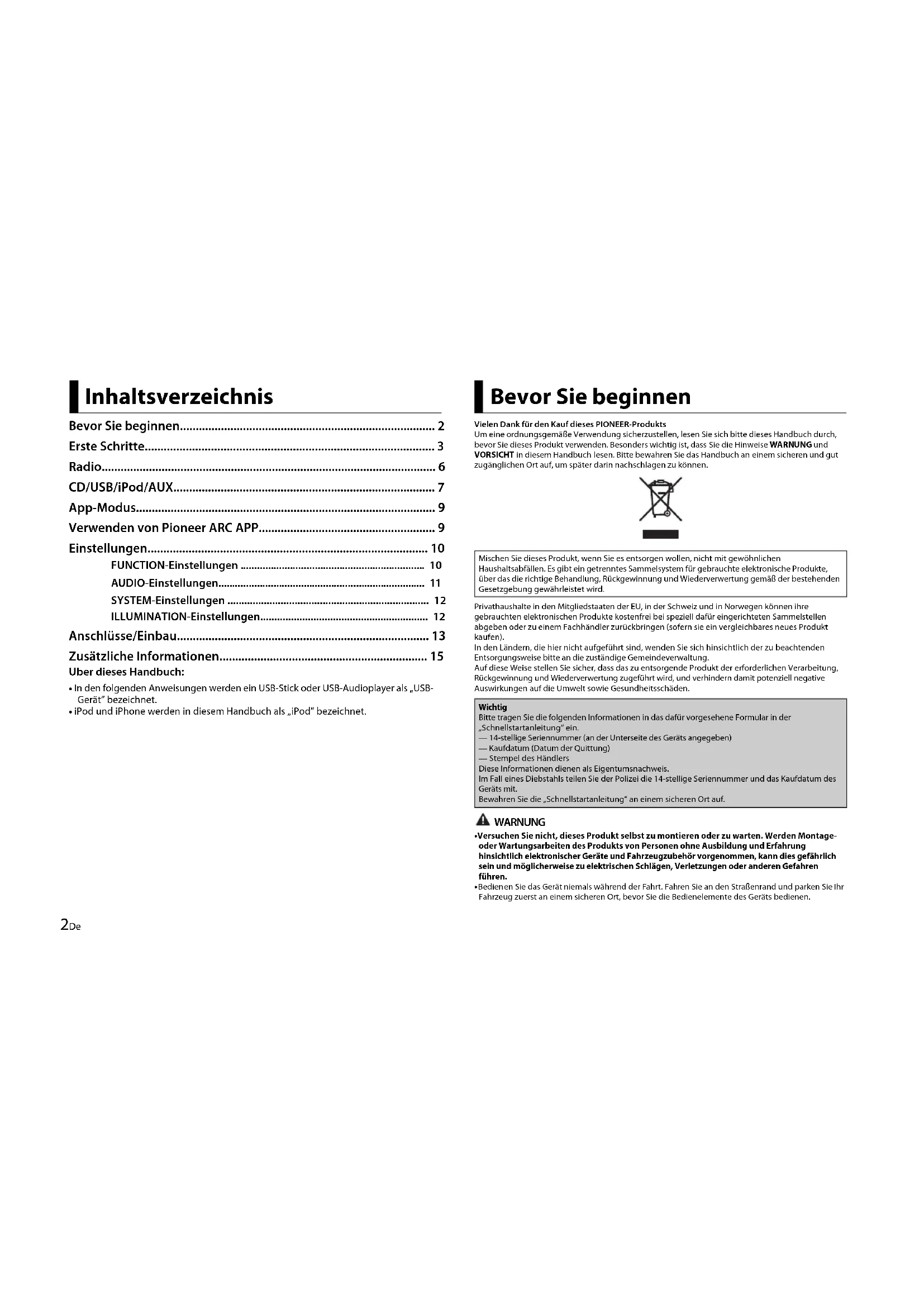 - iPod und iPhone werden in diesem Handbuch als „iPod” bezeichnet. Inhaltsverzeichnis Vielen Dank für den Kauf dieses PIONEER-ProduktsUm eine ordnungsgemäße Verwendung sicherzustellen, lesen Sie sich bitte dieses Handbuch durch, bevor Sie dieses Produkt verwenden. Besonders wichtig ist, dass Sie die Hinweise WARNUNG und VORSICHT in diesem Handbuch lesen. Bitte bewahren Sie das Handbuch an einem sicheren und gut zugänglichen Ort auf, um später darin nachschlagen zu können.Privathaushalte in den Mitgliedstaaten der EU, in der Schweiz und in Norwegen können ihre gebrauchten elektronischen Produkte kostenfrei bei speziell dafür eingerichteten Sammelstellen abgeben oder zu einem Fachhändler zurückbringen (sofern sie ein vergleichbares neues Produkt kaufen).In den Ländern, die hier nicht aufgeführt sind, wenden Sie sich hinsichtlich der zu beachtenden Entsorgungsweise bitte an die zuständige Gemeindeverwaltung.Auf diese Weise stellen Sie sicher, dass das zu entsorgende Produkt der erforderlichen Verarbeitung, Rückgewinnung und Wiederverwertung zugeführt wird, und verhindern damit potenziell negative Auswirkungen auf die Umwelt sowie Gesundheitsschäden. WARNUNG