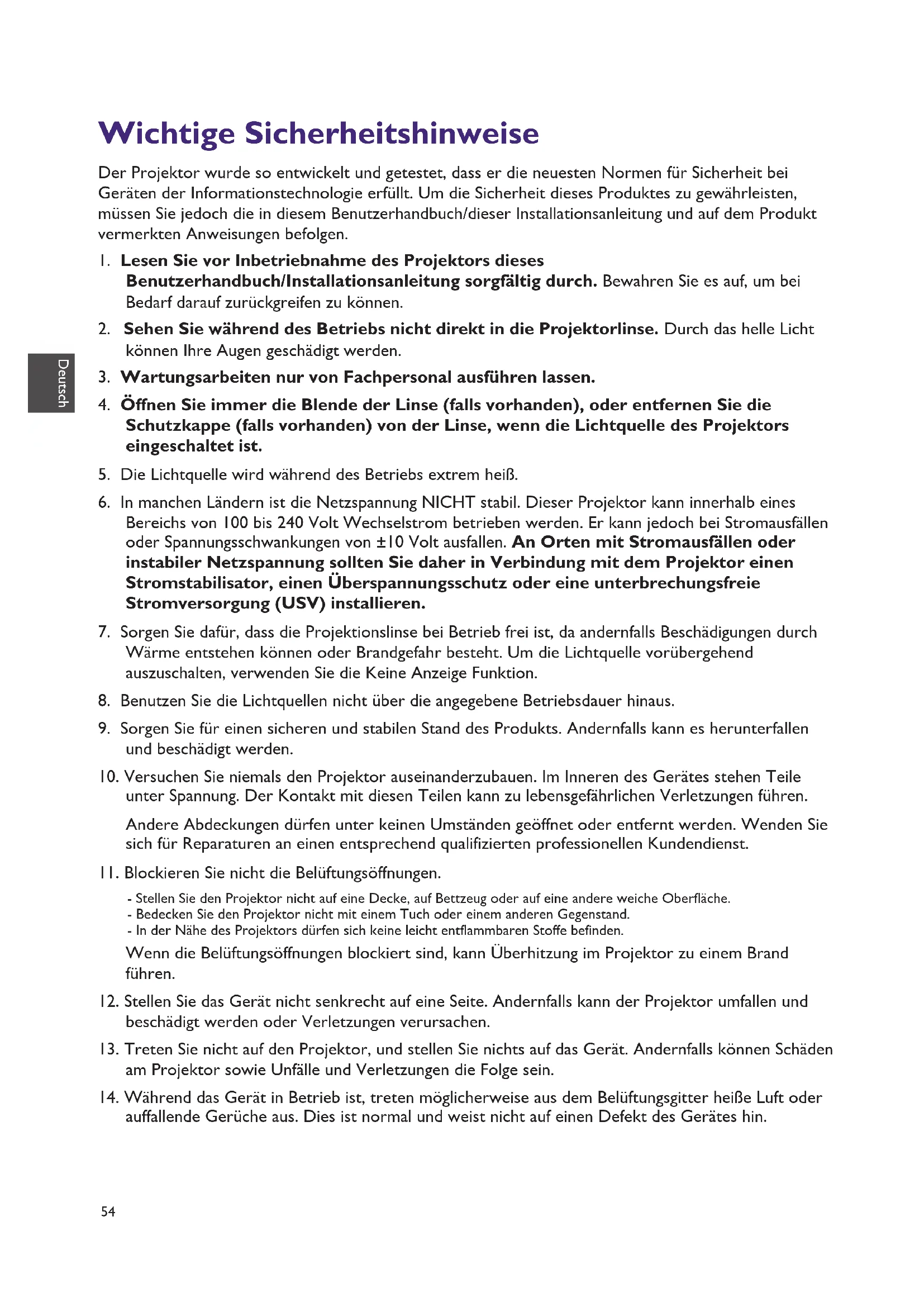13. Treten Sie nicht auf den Projektor, und stellen Sie nichts auf das Gerät. Andernfalls können Schäden