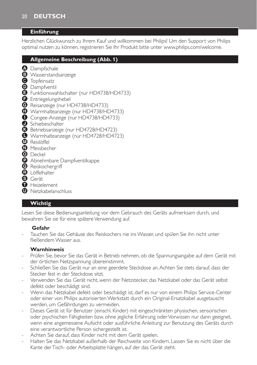 - Dieses Gerät ist nur für den Gebrauch im Haushalt bestimmt. Bei unsachgemäßem Gebrauch oder Verwendung für professionelle Zwecke oder bei Nichtbeachtung der Anweisungen in der Bedienungsanleitung erlischt die Garantie. In thisem Fall lehtn Philips jegliche Haftung für entwickelte Schäden ab.