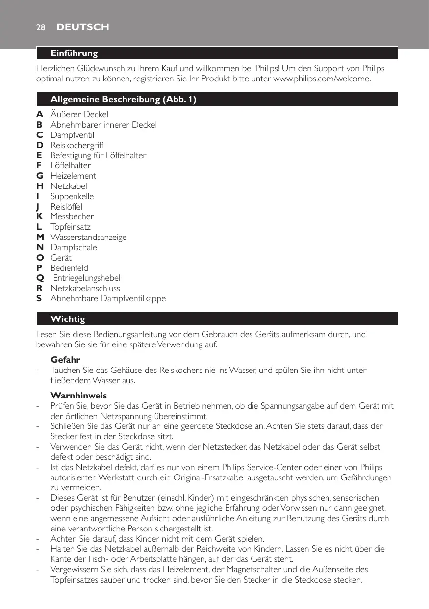 Danger -- Ne plongez jamais le corps du cuiseur à riz dans l’eau et ne le rincez pas sous le robinet. Avertissement -- Avant de brancher l’appareil, vérifiez que la tension indiquée sur l’appareil correspond à la tension secteur locale. -- Branchez l’appareil sur une prise murale mise à la terre. Assurez-vous que la fiche est correctement insérée dans la prise. -- N’utilisez jamais l’appareil si la fiche, le cordon d’alimentation ou l’appareil lui-même est endommagé. -- Si le cordon d’alimentation est endommagé, il doit être remplacé par Philips, un Centre Service Agréé Philips ou un technicien qualifié afin d’éviter tout accident. -- Cet appareil n’est pas destiné à être utilisé par des personnes (notamment des enfants) dont les capacités physiques, sensorielles ou intellectuelles sont réduites, ou par des personnes manquant d’expérience ou de connaissances, à moins que celles-ci ne soient sous surveillance ou qu’elles n’aient reçu des instructions quant à l’utilisation de l’appareil par une personne responsable de leur sécurité. -- Veillez à ce que les enfants ne puissent pas jouer avec l’appareil. -- Maintenez le cordon d’alimentation hors de portée des enfants. Ne le laissez pas dépasser de la table ou du plan de travail sur lequel l’appareil est posé. -- Assurez-vous que l’élément chauffant, l’interrupteur magnétique et l’extérieur de la cuve sont bien propres et secs avant de brancher l’appareil sur la prise secteur.