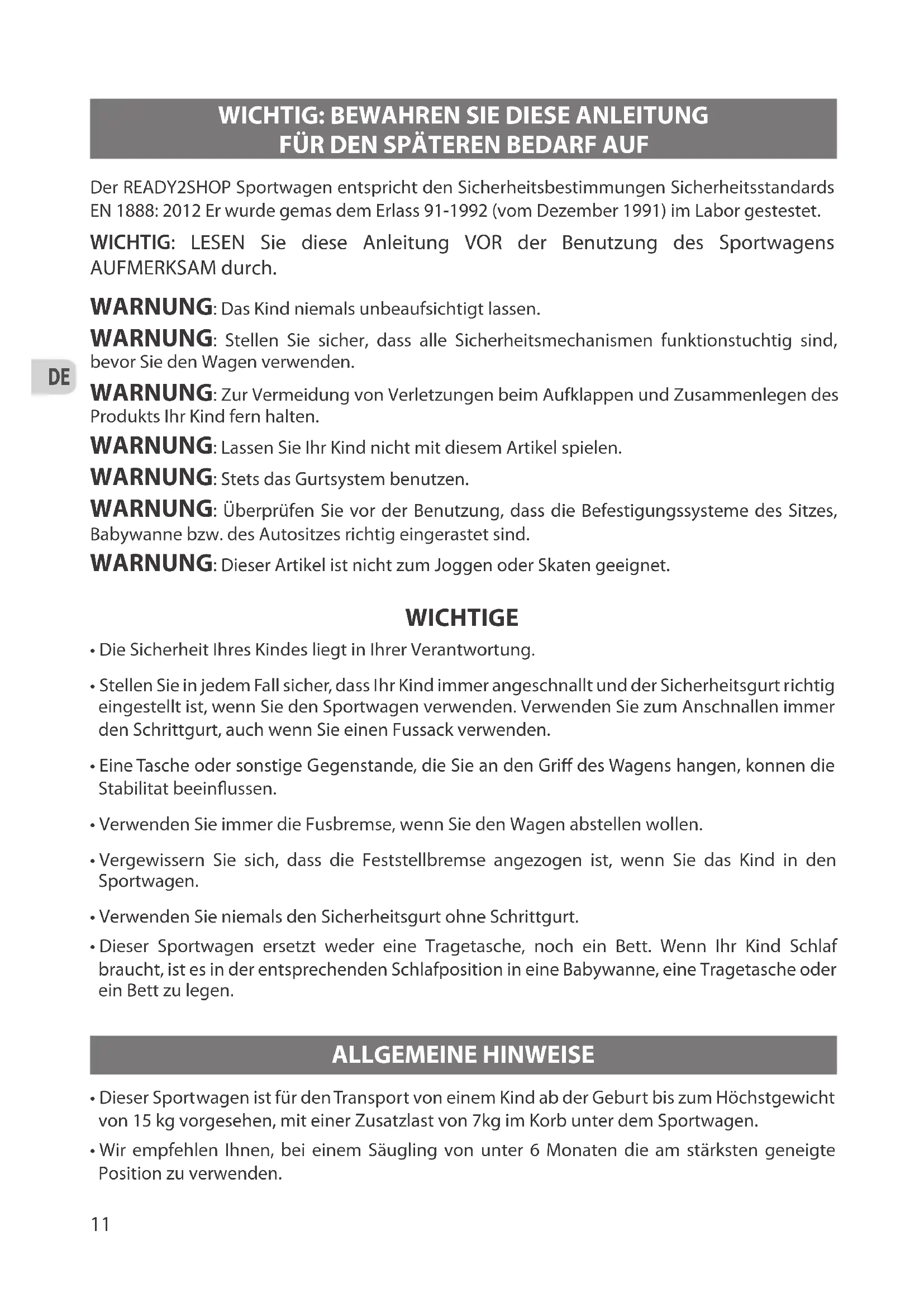 - Bitte fahren Sie mit Vorsicht über Hindernisse (Gehsteigkanten etc …) Häuges Stoßen gegen Hindernisse kann das Gestell Ihres Wagens beschädigen. Der READY2SHOP Sportwagen entspricht den Sicherheitsbestimmungen Sicherheitsstandards EN 1888: 2012 Er wurde gemas dem Erlass 91-1992 (vom Dezember 1991) im Labor gestestet. WICHTIG: LESEN Sie diese Anleitung VOR der Benutzung des Sportwagens AUFMERKSAM durch. WARNUNG: Das Kind niemals unbeaufsichtigt lassen. WARNUNG: Stellen Sie sicher, dass alle Sicherheitsmechanismen funktionstuchtig sind, bevor Sie den Wagen verwenden. WARNUNG: Zur Vermeidung von Verletzungen beim Aufklappen und Zusammenlegen des Produkts Ihr Kind fern halten. WARNUNG: Lassen Sie Ihr Kind nicht mit diesem Artikel spielen. WARNUNG: Stets das Gurtsystem benutzen. WARNUNG: Überprüfen Sie vor der Benutzung, dass die Befestigungssysteme des Sitzes, Babywanne bzw. des Autositzes richtig eingerastet sind. WARNUNG: Dieser Artikel ist nicht zum Joggen oder Skaten geeignet. WICHTIGE