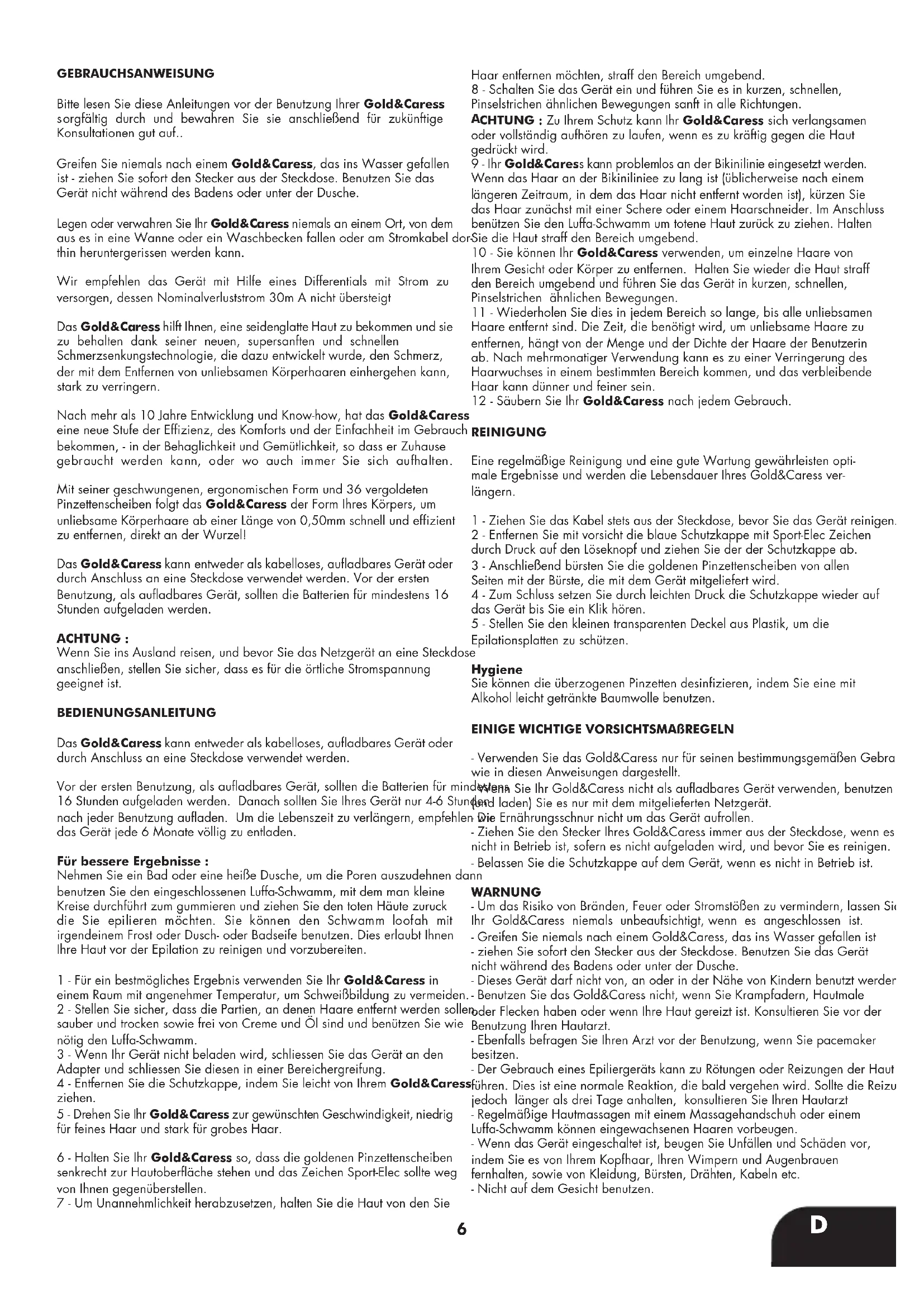 Epilationsplatten zu schützen. Hygiene Sie können die überzogenen Pinzetten desinfizieren, indem Sie eine mit Alkohol leicht getränkte Baumwolle benutzen. EINIGE WICHTIGE VORSICHTSMAßREGELN - Verwenden Sie das Gold&Caress nur für seinen bestimmungsgemäßen Gebrauch, wie in diesen Anweisungen dargestellt. - Wenn Sie Ihr Gold&Caress nicht als aufladbares Gerät verwenden, benutzen (und laden) Sie es nur mit dem mitgelieferten Netzgerät. - Die Ernährungsschnur nicht um das Gerät aufrollen. - Ziehen Sie den Stecker Ihres Gold&Caress immer aus der Steckdose, wenn es nicht in Betrieb ist, sofern es nicht aufgeladen wird, und bevor Sie es reinigen. - Belassen Sie die Schutzkappe auf dem Gerät, wenn es nicht in Betrieb ist. WARNUNG - Um das Risiko von Bränden, Feuer oder Stromstößen zu vermindern, lassen Sie Ihr Gold&Caress niemals unbeaufsichtigt, wenn es angeschlossen ist. - Greifen Sie niemals nach einem Gold&Caress, das ins Wasser gefallen ist - ziehen Sie sofort den Stecker aus der Steckdose. Benutzen Sie das Gerät nicht während des Badens oder unter der Dusche. - Dieses Gerät darf nicht von, an oder in der Nähe von Kindern benutzt werden. - Benutzen Sie das Gold&Caress nicht, wenn Sie Krampfadern, Hautmale oder Flecken haben oder wenn Ihre Haut gereizt ist. Konsultieren Sie vor der Benutzung Ihren Hautarzt. - Ebenfalls befragen Sie Ihren Arzt vor der Benutzung, wenn Sie pacemaker besitzen. - Der Gebrauch eines Epiliergeräts kann zu Rötungen oder Reizungen der Haut führen. Dies ist eine normale Reaktion, die bald vergehen wird. Sollte die Reizung jedoch länger als drei Tage anhalten, konsultieren Sie Ihren Hautarzt - Regelmäßige Hautmassagen mit einem Massagehandschuh oder einem Luffa-Schwamm können eingewachsenen Haaren vorbeugen. - Wenn das Gerät eingeschaltet ist, beugen Sie Unfällen und Schäden vor, indem Sie es von Ihrem Kopfhaar, Ihren Wimpern und Augenbrauen fernhalten, sowie von Kleidung, Bürsten, Drähten, Kabeln etc. - Nicht auf dem Gesicht benutzen.