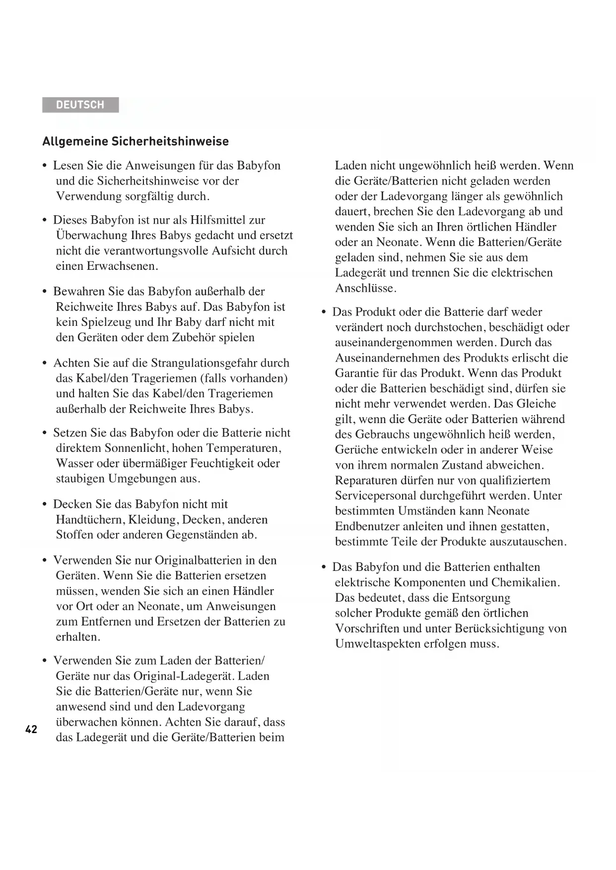 - Das Babyfon und die Batterien enthalten elektrische Komponenten und Chemikalien. Das bedeutet, dass die Entsorgung solcher Produkte gemäß den örtlichen Vorschriften und unter Berücksichtigung von Umweltaspekten erfolgen muss.43 Warnung! Die Batterien brauchen Aufmerksamkeit. Wenn Sie eine Batterie laden, besteht immer die Gefahr eines Kurzschlusses und eine Fabrikationsfehler kann dazu führen, dass die Batterie überhitzt oder Feuer fängt. Wir raten daher dringend, dass Sie die Batterien niemals unbeaufsichtigt laden. Warnung!