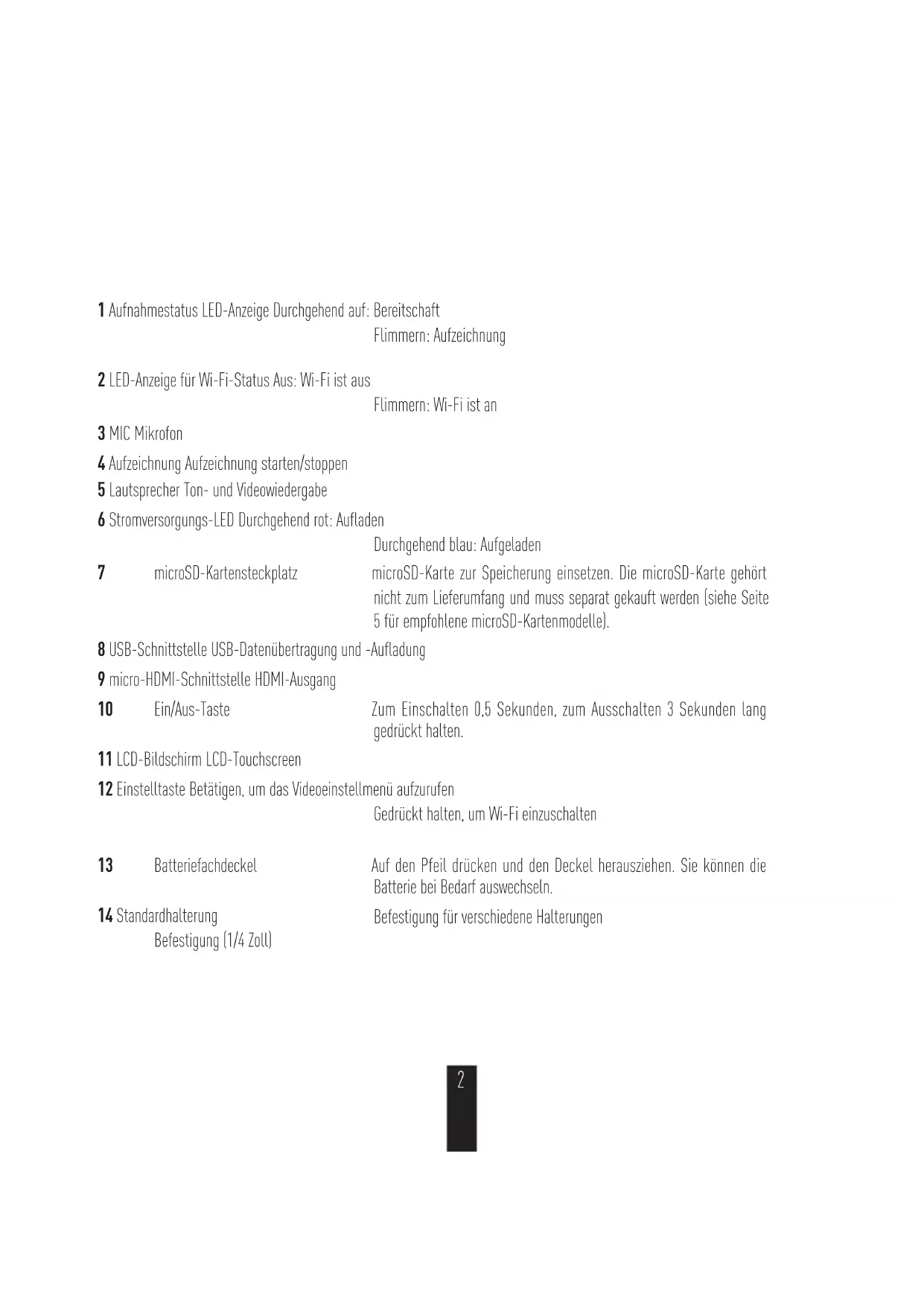 Allgemeines 11 Aufnahmestatus LED-Anzeige Durchgehend auf: Bereitschaft Flimmern: Aufzeichnung 2 LED-Anzeige für Wi-Fi-Status Aus: Wi-Fi ist aus Flimmern: Wi-Fi ist an 3 MIC Mikrofon 4 Aufzeichnung Aufzeichnung starten/stoppen 5 Lautsprecher Ton- und Videowiedergabe 6 Stromversorgungs-LED Durchgehend rot: Aufladen Durchgehend blau: Aufgeladen 7 microSD-Kartensteckplatz microSD-Karte zur Speicherung einsetzen. Die microSD-Karte gehört nicht zum Lieferumfang und muss separat gekauft werden (siehe Seite 5 für empfohlene microSD-Kartenmodelle). 8 USB-Schnittstelle USB-Datenübertragung und -Aufladung 9 micro-HDMI-Schnittstelle HDMI-Ausgang 10 Ein/Aus-Taste Zum Einschalten 0,5 Sekunden, zum Ausschalten 3 Sekunden lang gedrückt halten. 11 LCD-Bildschirm LCD-Touchscreen 12 Einstelltaste Betätigen, um das Videoeinstellmenü aufzurufen Gedrückt halten, um Wi-Fi einzuschalten 13 Batteriefachdeckel Auf den Pfeil drücken und den Deckel herausziehen. Sie können die Batterie bei Bedarf auswechseln. 14 Standardhalterung Befestigung (1/4 Zoll) Befestigung für verschiedene Halterungen 2Bildschirm 00:00:00|02:00:00 4K/30/ Wide