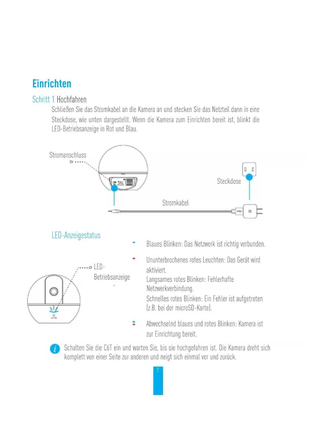 Wi-Fi network, it will automatically connect to the same Wi-Fi network. Solid Wall Wooden Wall6 Appendix Box Content C6T (x1) Base (x1) Power Cable (x1) Drill Template (x1) Screw Kit (x1) Power Adapter (x1) Quick Start Guide x(1)7 Einrichten Schritt 1 Hochfahren Schließen Sie das Stromkabel an die Kamera an und stecken Sie das Netzteil dann in eine Steckdose, wie unten dargestellt. Wenn die Kamera zum Einrichten bereit ist, blinkt die LED-Betriebsanzeige in Rot und Blau. Steckdose Stromanschluss Stromkabel LED-Anzeigestatus Blaues Blinken: Das Netzwerk ist richtig verbunden. Ununterbrochenes rotes Leuchten: Das Gerät wird aktiviert. Langsames rotes Blinken: Fehlerhafte Netzwerkverbindung. Schnelles rotes Blinken: Ein Fehler ist aufgetreten (z.B. bei der microSD-Karte). Abwechselnd blaues und rotes Blinken: Kamera ist zur Einrichtung bereit. LED- Betriebsanzeige Schalten Sie die C6T ein und warten Sie, bis sie hochgefahren ist. Die Kamera dreht sich komplett von einer Seite zur anderen und neigt sich einmal vor und zurück.8 Schritt 2 Kamera einrichten
