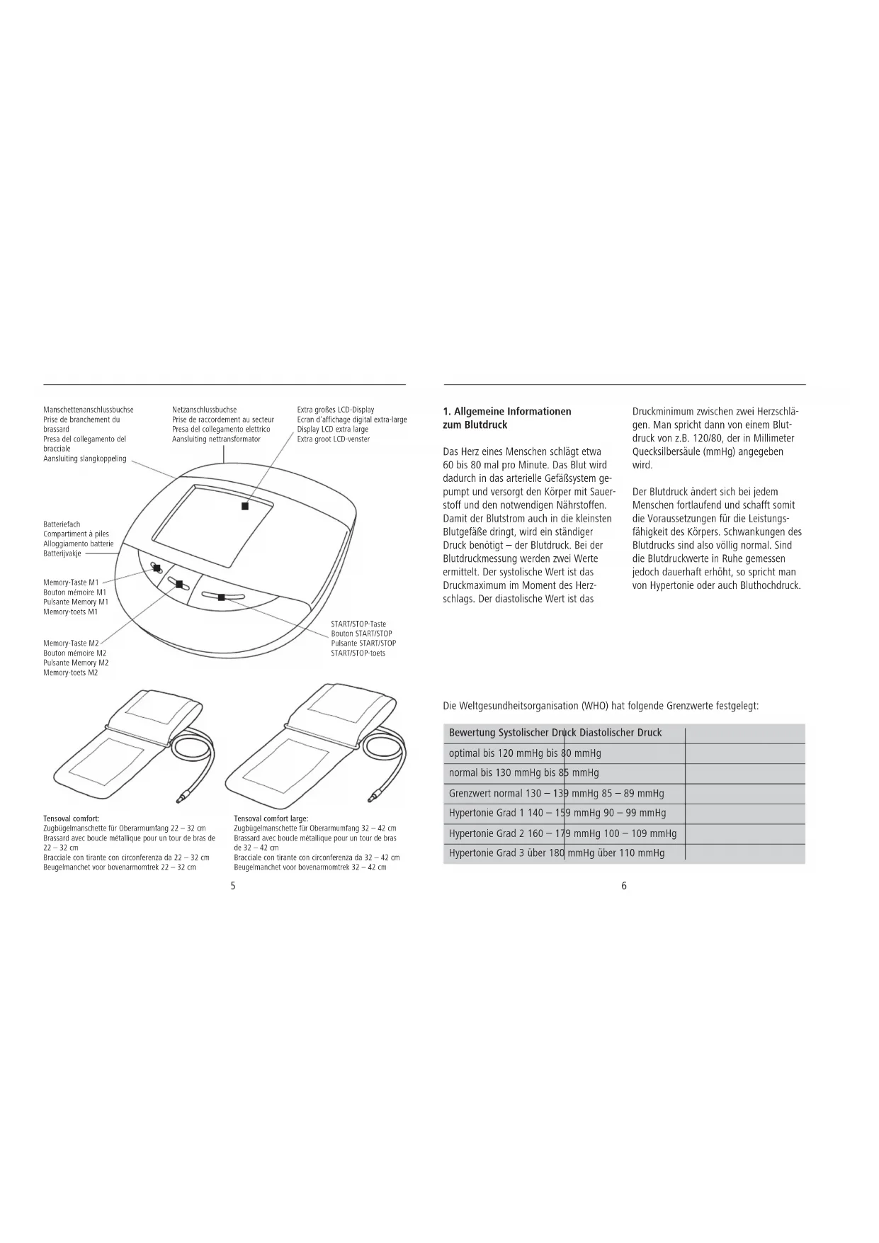 Netzanschlussbuchse Prise de raccordement au secteur Presa del collegamento elettrico Aansluiting nettransformator Extra großes LCD-Display Ecran d’affichage digital extra-large Display LCD extra large Extra groot LCD-venster Memory-Taste M1 Bouton mémoire M1 Pulsante Memory M1 Memory-toets M1 Tensoval comfort: Zugbügelmanschette für Oberarmumfang 22 – 32 cm Brassard avec boucle métallique pour un tour de bras de 22 – 32 cm Bracciale con tirante con circonferenza da 22 – 32 cm Beugelmanchet voor bovenarmomtrek 22 – 32 cm Tensoval comfort large: Zugbügelmanschette für Oberarmumfang 32 – 42 cm Brassard avec boucle métallique pour un tour de bras de 32 – 42 cm Bracciale con tirante con circonferenza da 32 – 42 cm Beugelmanchet voor bovenarmomtrek 32 – 42 cm Memory-Taste M2 Bouton mémoire M2 Pulsante Memory M2 Memory-toets M2 Druckminimum zwischen zwei Herzschlä- gen. Man spricht dann von einem Blut- druck von z.B. 120/80, der in Millimeter Quecksilbersäule (mmHg) angegeben wird. Der Blutdruck ändert sich bei jedem Menschen fortlaufend und schafft somit die Voraussetzungen für die Leistungs- fähigkeit des Körpers. Schwankungen des Blutdrucks sind also völlig normal. Sind die Blutdruckwerte in Ruhe gemessen jedoch dauerhaft erhöht, so spricht man von Hypertonie oder auch Bluthochdruck.