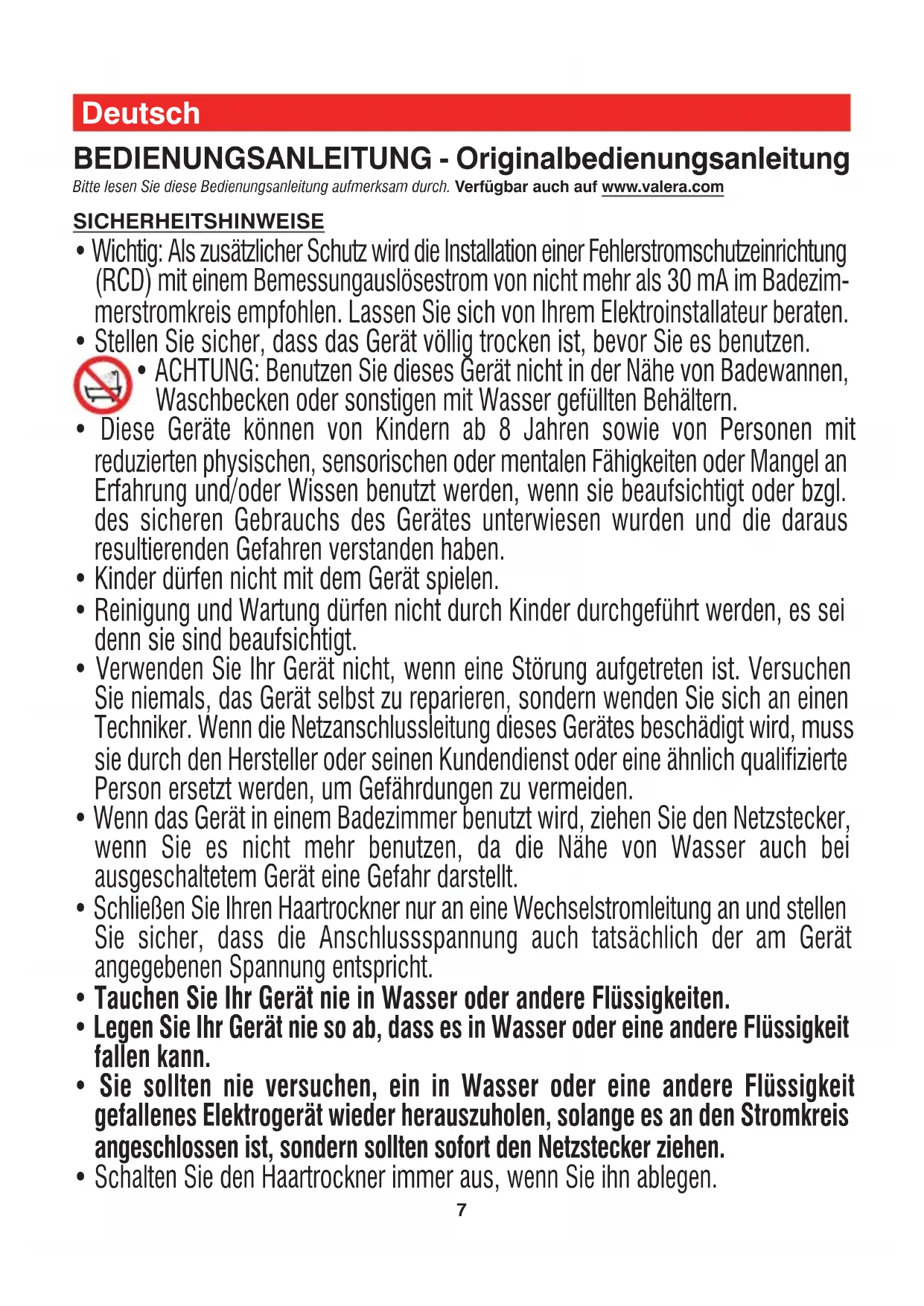 Vor der Säuberung des Gerätes stets erst den Netzstecker ziehen! Sie können das Gerät mit einem feuchten Tuch abwischen. Das Gerät sollte jedoch niemals in Wasser oder einer anderen Flüssigkeit gespült werden! Schützen Sie Ihr Gerät vor Staub. Wenn nötig, ist das Luftauslassgitter mit einer Bürste oder einem Pinsel zu säubern. ACHTUNG: Die Reinigung der Haartrockner mit Reinigern, Lösungsmitteln, Alkohol und sonstigen Chemikalien ist streng verboten. Änderungen vorbehalten Garantiebedingungen VALERA leistet für dieses Gerät – zusätzlich zu der gesetzlichen Gewährleistung des Händlers aus Kaufvertrag – dem Endabnehmer gegenüber eine Garantie zu nachstehenden Bedingungen: