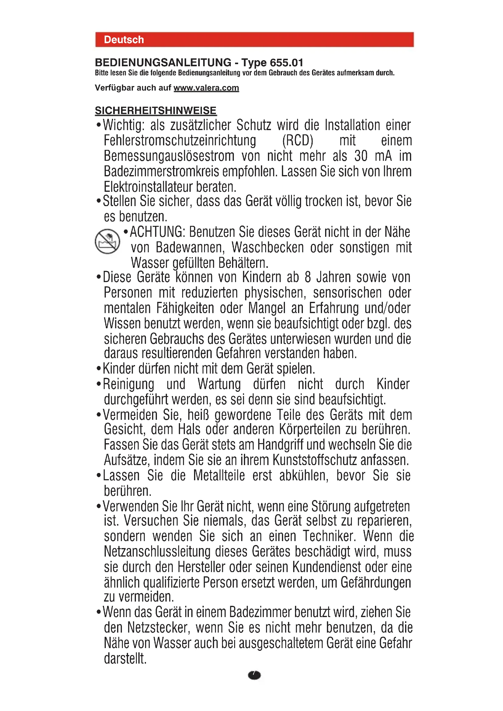 Ziehen Sie vor dem Reinigen des Geräts immer den Netzstecker! Das Gerät vor dem Reinigen abkühlen lassen. Reinigen Sie das Gerät mit einem feuchten Tuch und tauchen Sie es niemals in Wasser oder andere Flüssigkeiten! Dieses Gerät erfüllt die Bestimmungen der europäischen Richtlinien 2004/108/EG, 2009/125/EG, 2006/95/EG und der Verordnung (EG) Nr. 1275/2008. GARANTIEBEDINGUNGEN VALERA leistet für dieses Gerät – zusätzlich zu der gesetzlichen Gewährleistung des Händlers aus Kaufvertrag - dem Endabnehmer gegenüber eine Garantie zu nachstehenden Bedingungen: