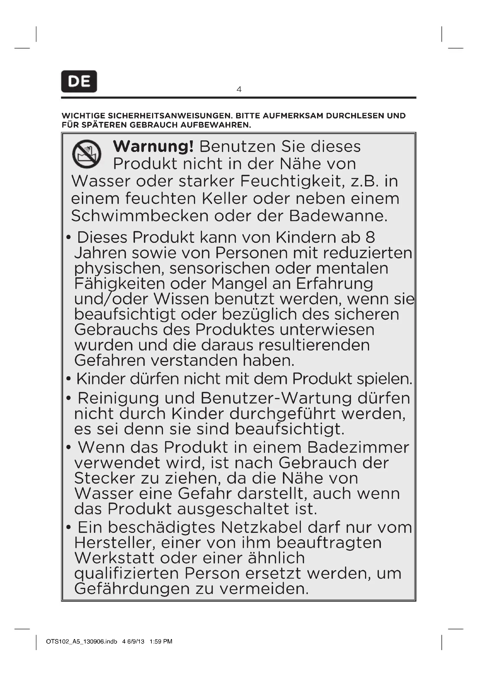- Ein beschädigtes Netzkabel darf nur vom Hersteller, einer von ihm beauftragten Werkstatt oder einer ähnlich qualifizierten Person ersetzt werden, um Gefährdungen zu vermeiden. OTS102_A5_130906.indb 4 6/9/13 1:59 PM5