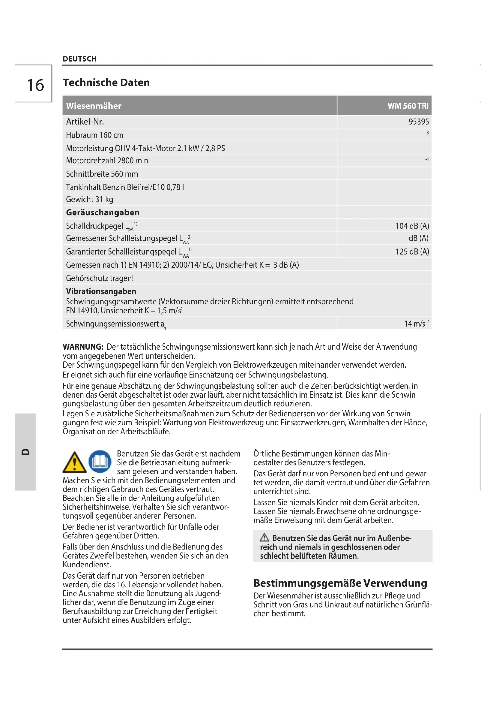 Technische Gegevens Grasmaaier WM 560 TRI Artikel-Nr.