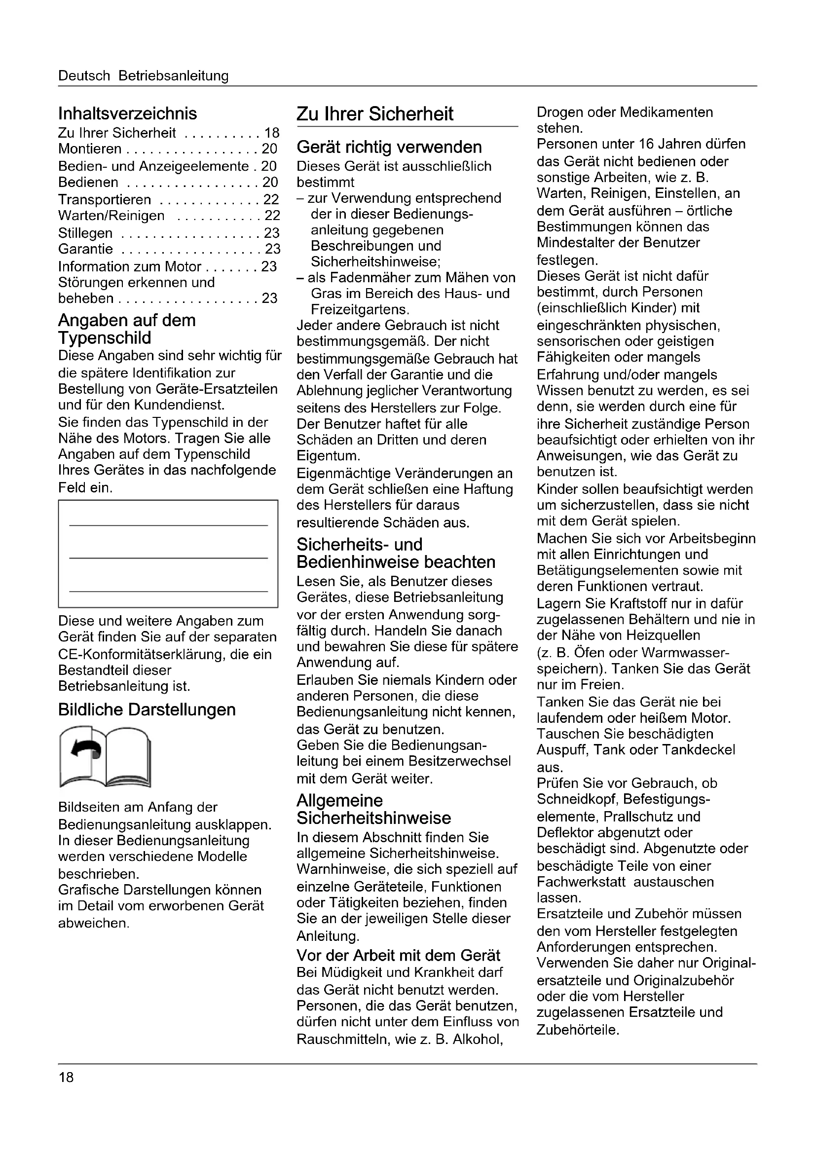 - Störungen erkennen und beheben Angaben auf dem Typenschild Diese Angaben sind sehr wichtig für die spätere Identifikation zur Bestellung von Geräte-Ersatzteilen und für den Kundendienst. Sie finden das Typenschild in der Nähe des Motors. Tragen Sie alle Angaben auf dem Typenschild Ihres Gerätes in das nachfolgende Feld ein. Diese und weitere Angaben zum Gerät finden Sie auf der separaten CE-Konformitätserklärung, die ein Bestandteil dieser Betriebsanleitung ist. Bildliche Darstellungen Bildseiten am Anfang der Bedienungsanleitung ausklappen. In dieser Bedienungsanleitung werden verschiedene Modelle beschrieben. Grafische Darstellungen können im Detail vom erworbenen Gerät abweichen. Zu Ihrer Sicherheit Gerät richtig verwenden Dieses Gerät ist ausschließlich bestimmt – zur Verwendung entsprechend der in dieser Bedienungs- anleitung gegebenen Beschreibungen und Sicherheitshinweise; – als Fadenmäher zum Mähen von Gras im Bereich des Haus- und Freizeitgartens. Jeder andere Gebrauch ist nicht bestimmungsgemäß. Der nicht bestimmungsgemäße Gebrauch hat den Verfall der Garantie und die Ablehnung jeglicher Verantwortung seitens des Herstellers zur Folge. Der Benutzer haftet für alle Schäden an Dritten und deren Eigentum. Eigenmächtige Veränderungen an dem Gerät schließen eine Haftung des Herstellers für daraus resultierende Schäden aus. Sicherheits- und Bedienhinweise beachten Lesen Sie, als Benutzer dieses Gerätes, diese Betriebsanleitung vor der ersten Anwendung sorg- fältig durch. Handeln Sie danach und bewahren Sie diese für spätere Anwendung auf. Erlauben Sie niemals Kindern oder anderen Personen, die diese Bedienungsanleitung nicht kennen, das Gerät zu benutzen. Geben Sie die Bedienungsan- leitung bei einem Besitzerwechsel mit dem Gerät weiter. Allgemeine Sicherheitshinweise In diesem Abschnitt finden Sie allgemeine Sicherheitshinweise. Warnhinweise, die sich speziell auf einzelne Geräteteile, Funktionen oder Tätigkeiten beziehen, finden Sie an der jeweiligen Stelle dieser Anleitung. Vor der Arbeit mit dem Gerät Bei Müdigkeit und Krankheit darf das Gerät nicht benutzt werden. Personen, die das Gerät benutzen, dürfen nicht unter dem Einfluss von Rauschmitteln, wie z. B. Alkohol, Drogen oder Medikamenten stehen. Personen unter 16 Jahren dürfen das Gerät nicht bedienen oder sonstige Arbeiten, wie z. B. Warten, Reinigen, Einstellen, an dem Gerät ausführen – örtliche Bestimmungen können das Mindestalter der Benutzer festlegen. Dieses Gerät ist nicht dafür bestimmt, durch Personen (einschließlich Kinder) mit eingeschränkten physischen, sensorischen oder geistigen Fähigkeiten oder mangels Erfahrung und/oder mangels Wissen benutzt zu werden, es sei denn, sie werden durch eine für ihre Sicherheit zuständige Person beaufsichtigt oder erhielten von ihr Anweisungen, wie das Gerät zu benutzen ist. Kinder sollen beaufsichtigt werden um sicherzustellen, dass sie nicht mit dem Gerät spielen. Machen Sie sich vor Arbeitsbeginn mit allen Einrichtungen und Betätigungselementen sowie mit deren Funktionen vertraut. Lagern Sie Kraftstoff nur in dafür zugelassenen Behältern und nie in der Nähe von Heizquellen (z. B. Öfen oder Warmwasser- speichern). Tanken Sie das Gerät nur im Freien. Tanken Sie das Gerät nie bei laufendem oder heißem Motor. Tauschen Sie beschädigten Auspuff, Tank oder Tankdeckel aus. Prüfen Sie vor Gebrauch, ob Schneidkopf, Befestigungs- elemente, Prallschutz und Deflektor abgenutzt oder beschädigt sind. Abgenutzte oder beschädigte Teile von einer Fachwerkstatt austauschen lassen. Ersatzteile und Zubehör müssen den vom Hersteller festgelegten Anforderungen entsprechen. Verwenden Sie daher nur Original- ersatzteile und Originalzubehör oder die vom Hersteller zugelassenen Ersatzteile und Zubehörteile.Betriebsanleitung Deutsch Nur die vom Hersteller frei-gegebenen Schneidfäden/Schneidvorrichtungen verwenden. Reparaturen ausschließlich von einer Fachwerkstatt ausführen lassen. Während der Arbeit mit dem Gerät Bei Arbeiten mit oder an dem Gerät müssen Sie eine entsprechende Arbeitskleidung tragen, wie beispielsweise:– Sicherheitsschuhe,– lange Hosen,– enganliegende Kleidung,– Gehörschutz,– Schutzbrille.Alle Sicherheitseinrichtungen müssen immer vollständig und in einwandfreiem Zustand am Gerät angebracht sein. An den Sicherheitseinrichtungen keine Veränderungen vornehmen.Betreiben Sie das Gerät nur in dem vom Hersteller vorgeschriebenen und angelieferten technischen Zustand.Verändern Sie niemals die werksseitig voreingestellten Motoreinstellungen.Vermeiden Sie offenes Feuer, Funkenbildung und rauchen Sie nicht. Vor allen Arbeiten an diesem Gerät Zum Schutze vor Verletzungen vor allen Arbeiten (z. B. Wartungs- und Einstellarbeiten) und Transport (z. B. heben oder tragen) an diesem Gerät– den Motor abstellen,– abwarten, bis alle beweglichen Teile vollständig zum Stillstand gekommen sind und der Motor abgekühlt ist,– den Zündkerzenstecker am Motor ziehen, um ein versehentliches Starten des Motors zu verhindern,– die zusätzlichen Sicherheitshinweise im Motorenhandbuch beachten. Nach der Arbeit mit dem Gerät Verlassen Sie das Gerät nie, ohne den Motor abzustellen. Sicherheitseinrichtungen Bild 1 Gefahr Benutzen Sie niemals ein Gerät mit beschädigten oder ohne angebaute Sicherheitsein- richtungen. Sicherheitsbügel (1) Der Sicherheitsbügel dient Ihrer Sicherheit, um Motor und Schneidwerk im Notfall sofort zu stoppen. Es darf nicht versucht werden, seine Funktion zu umgehen. Prallschutz (5) Der Prallschutz schützt Sie vor Verletzungen durch heraus-geschleuderte Gegenstände. Deflektor (7) Der Deflektor schützt Sie vor Verletzungen durch den Schneidkopf oder heraus-geschleuderte Gegenstände. Symbole am Gerät Am Gerät finden Sie verschiedene Symbole als Aufkleber. Nachfolgend die Erklärung der Symbole:Achtung! Vor Inbetriebnahme Bedienungsanleitung lesen!Bei Arbeiten mit dem Gerät 