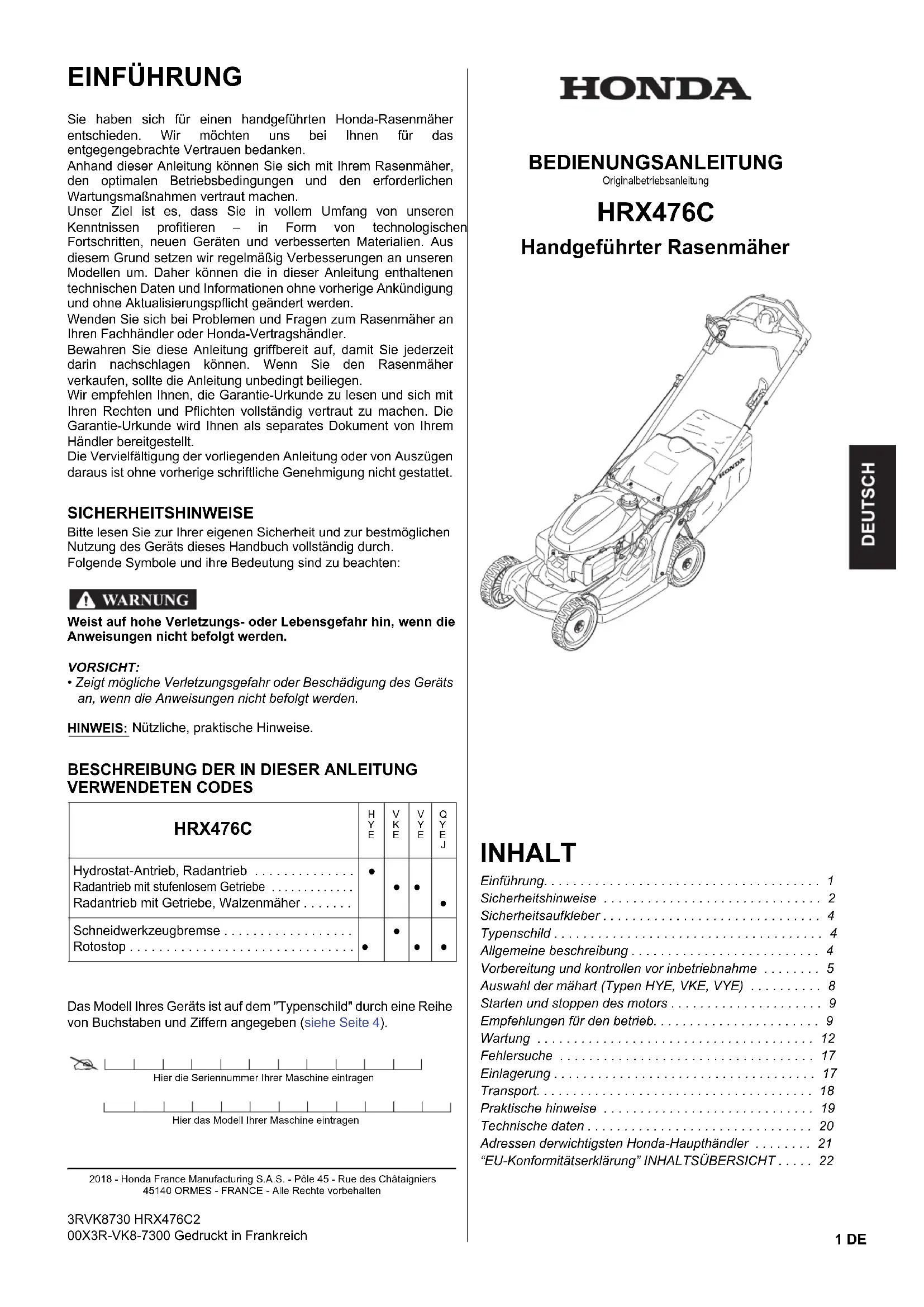 [1] WARNUNG: Lesen Sie vor dem Betrieb des Rasenmähers die Bedienungsanleitung.[2] Gefahr durch hochgeschleuderte Gegenstände: Bei Betrieb Dritte vom Gefahrenbereich fernhalten.[3] Verletzungsgefahr. Gefahr durch umlaufende Schneidwerkzeuge: Hände und Füße fernhalten. Vor allen Wartungs- oder Reparaturarbeiten den Zündkerzenstecker abziehen.[4] Beim Betrieb müssen die Auswurfabdeckung oder der Schnittgutsammler angebracht sein.[5] Der Motor stößt giftiges Kohlenmonoxid aus. Nicht in geschlossenen Räumen betreiben.[6] Benzin ist hochentzündlich. Vor dem Betanken den Motor abstellen.[7] Schall-Leistungspegel[8] CE-Zeichen[9] Nennleistung in Kilowatt[10] Empfohlene Motordrehzahl in min (U/min)[11] Gewicht in Kilogramm (mit leeren Tanks)[12] Baujahr[13] Seriennummer[14] Modell - Typenbezeichnung[15] Name und Anschrift des Herstellers [2] [1] [4] [3] [1] [5] [6] [A] [7] [8] [9] [11] [10] [13] [14] [15] Honda France Manufacturing S.A.S.Rue des Châtaigniers - Pôle 4545140 Ormes - France [12] BEDIENEINRICHTUNGEN FUNKTIONEN[16] Lenker[17] Stellteil für das Schneidwerkzeug (Rotostop) (*) . . . . . . . . . . . . . . . . Einkuppeln und Anhalten des Schneidwerkzeugs[18] Hebel zum Einstellen der Schnitthöhe . . . . . . . . . . . . . . . . . . Auswählen der gewünschten Schnitthöhe [19] Knopf zum Umklappen/zur Höhenverstellung des Lenkers (*). . . Einstellen der Lenkerhöhe oder Umklappen des Lenkers[20] Entriegelungsknopf des Stellteils für das Schneidwerkzeug (*) . . . . . . . Betätigung des Stellteils für das Schneidwerkzeug[21] Schalthebel (*). . . . . . . . . . . . . . . . Regulierung der Höchstfahrgeschwindigkeit [22] Antriebskupplungshebel (*). . . . . . Steuerung des Antriebsgetriebes für die Hinterräder oder die hintere Walze [23] Bremshebel für das Schneidwerkzeug (*). . . Stoppen der Drehung des Schneidwerkzeugs und des Motors/Ermöglichen der Inbetriebnahme [24] Gashebel (*) . . . . . . . . . . . . . . . . . Regelung der Motordrehzahl [25] Kraftstofftank[26] Luftfilter[27] Zündkerze[28] Motoröltank [29] Entriegelungsknopf des Schnitthöheneinstellhebels (*) [30] Schnittgutsammler . . . . . . . . . . . . Sammlung des Schnittguts [31] Auswurfabdeckung . . . . . . . . . . . . Schutz vor hochgeschleuderten Gegenständen [32] Seilzug . . . . . . . . . . . . . . . . . . . . . Starten des Motors [33] Schalldämpfer [34] Kraftstoffhahn . . . . . . . . . . . . . . . . Schließen/Öffnen der Benzinzufuhr [35] Steuerung der variablen Mulching-Funktion (*). . . Steuert die Menge des ausgeworfenen Grases[36] Select Drive-Steuerung (*) . . . . . . Antriebssteuerung für die Hinterräder. Regulierung der Höchstfahrgeschwindigkeit [37] Hebel zum Umklappen/zur Höhenverstellung des Lenkers (*). . . Einstellen der Lenkerhöhe oder Umklappen des Lenkers[38] Hintere Walze (*)(*) Entsprechend ausgestattete Modelle [24] [30] [31] [19] [18] VYE [34] [26] [29] [27] [33] [28] [25] [35] [16] [32] [A] [17] [36] [20] [36] [23] VKE STOP [17] [22] [21] [24] HYE [20] [38] [18] [37] [17] [22] QYEJ [24] [20]5 DE VORBEREITUNG UND KONTROLLEN VOR INBETRIEBNAHME Prüfen Sie vor jedem Gebrauch die Außen- und Unterseite des Motors auf Anzeichen von Öl- oder Benzinlecks.Stellen Sie den Rasenmäher zur Ausführung dieser Arbeiten mit abgestelltem Motor auf stabilen und ebenen Untergrund. Der Zündkerzenstecker [1] muss abgezogen werden.