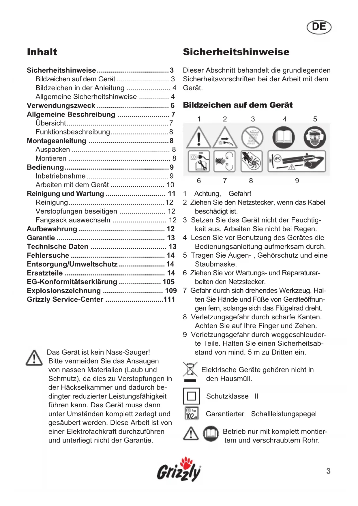 Bitte vermeiden Sie das Ansaugen von nassen Materialien (Laub und Schmutz), da dies zu Verstopfungen in der Häckselkammer und dadurch bedingter reduzierter Leistungsfähigkeit führen kann. Das Gerät muss dann unter Umständen komplett zerlegt und gesaubert werden. Diese Arbeit ist von einer Elektrofachkraft durchzufahren und unterliegt nicht der Garantie.