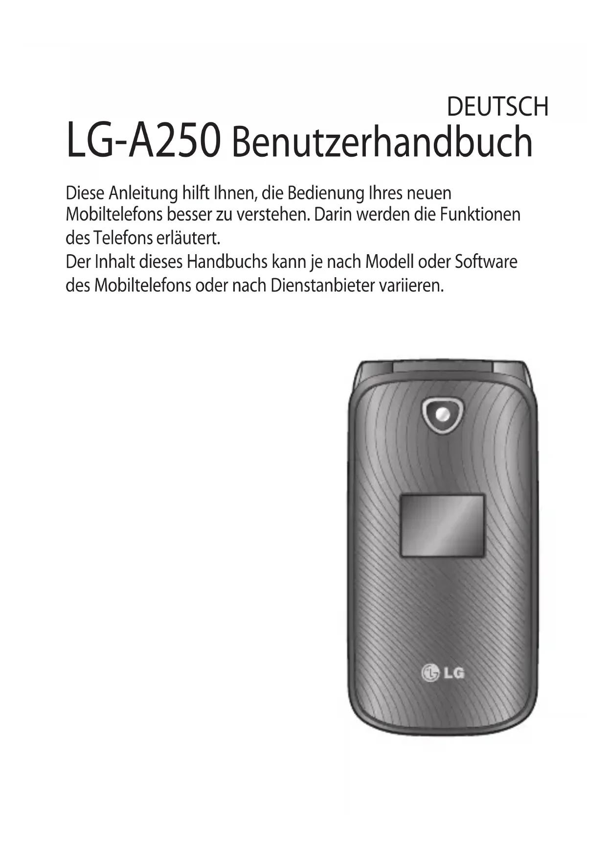 Benutzerhandbuch LG-A250 P/N : MFL67288501 (1.0) www.lg.com Allgemeine Anfragen<LG Informationscenter für Kunden>Service Hotline Österreich: 0810 144 131 (zum Ortstarif)Service Hotline Schweiz: 0848 543 543 (zum Ortstarif)* Vergewissern Sie sich, dass diese Rufnummer korrekt ist, bevor Sie anrufen.Informations générales<Centre d’information clientèle LG>Autriche: 0810 144 131Suisse: 0848 543 543* Avant d’appeler, vérifi ez que le numéro est correct.Informazioni generiche<LG Customer Information Center>Austria: 0810 144 131Svizzera: 0848 543 543