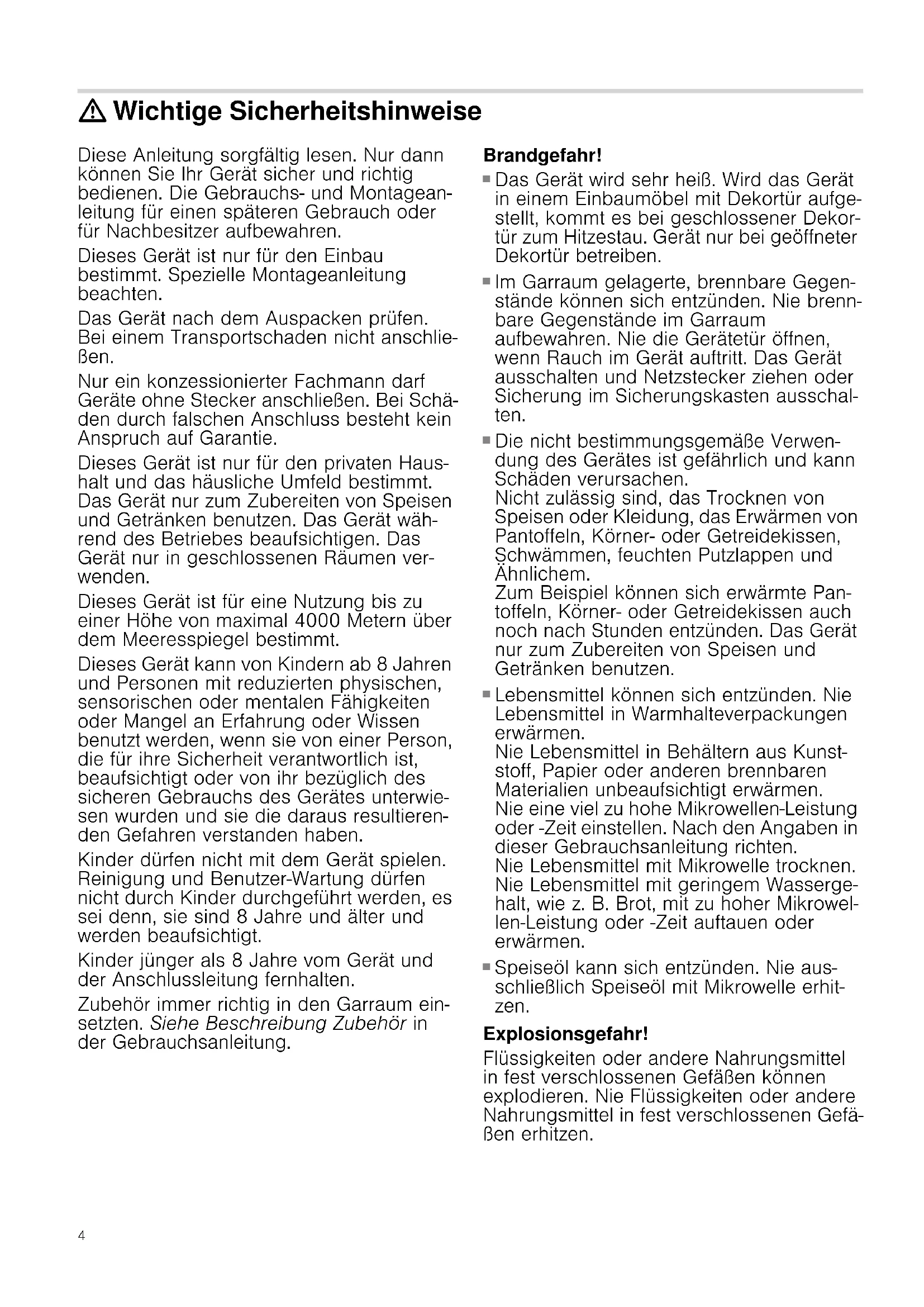 Speiseöl kann sich entzünden. Nie aus- schließlich Speiseöl mit Mikrowelle erhit- zen. Explosionsgefahr! Flüssigkeiten oder andere Nahrungsmittel in fest verschlossenen Gefäßen können explodieren. Nie Flüssigkeiten oder andere Nahrungsmittel in fest verschlossenen Gefä- ßen erhitzen.5 Gefahr schwerer Gesundheitsschäden!