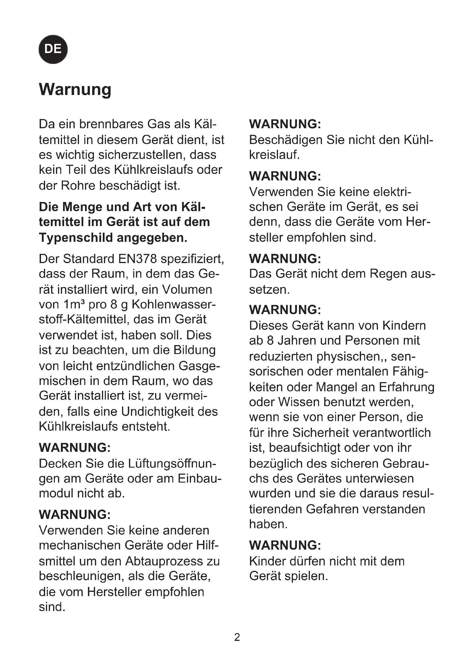 WARNUNG: Beschädigen Sie nicht den Kühl- kreislauf. WARNUNG: Verwenden Sie keine elektri- schen Geräte im Gerät, es sei denn, dass die Geräte vom Her- steller empfohlen sind. WARNUNG: Das Gerät nicht dem Regen aus- setzen. WARNUNG: Dieses Gerät kann von Kindern ab 8 Jahren und Personen mit reduzierten physischen,, sen- sorischen oder mentalen Fähig- keiten oder Mangel an Erfahrung oder Wissen benutzt werden, wenn sie von einer Person, die für ihre Sicherheit verantwortlich ist, beaufsichtigt oder von ihr bezüglich des sicheren Gebrau- chs des Gerätes unterwiesen wurden und sie die daraus resul- tierenden Gefahren verstanden haben. WARNUNG: Kinder dürfen nicht mit dem Gerät spielen. Da ein brennbares Gas als Käl- temittel in diesem Gerät dient, ist es wichtig sicherzustellen, dass kein Teil des Kühlkreislaufs oder der Rohre beschädigt ist. Die Menge und Art von Käl- temittel im Gerät ist auf dem Typenschild angegeben. Der Standard EN378 speziziert, dass der Raum, in dem das Ge- rät installiert wird, ein Volumen von 1m³ pro 8 g Kohlenwasser- sto-Kältemittel, das im Gerät verwendet ist, haben soll. Dies ist zu beachten, um die Bildung von leicht entzündlichen Gasge- mischen in dem Raum, wo das Gerät installiert ist, zu vermei- den, falls eine Undichtigkeit des Kühlkreislaufs entsteht. WARNUNG: Decken Sie die Lüftungsönun- gen am Geräte oder am Einbau- modul nicht ab. WARNUNG: Verwenden Sie keine anderen mechanischen Geräte oder Hilf- smittel um den Abtauprozess zu beschleunigen, als die Geräte, die vom Hersteller empfohlen sind. Warnung3