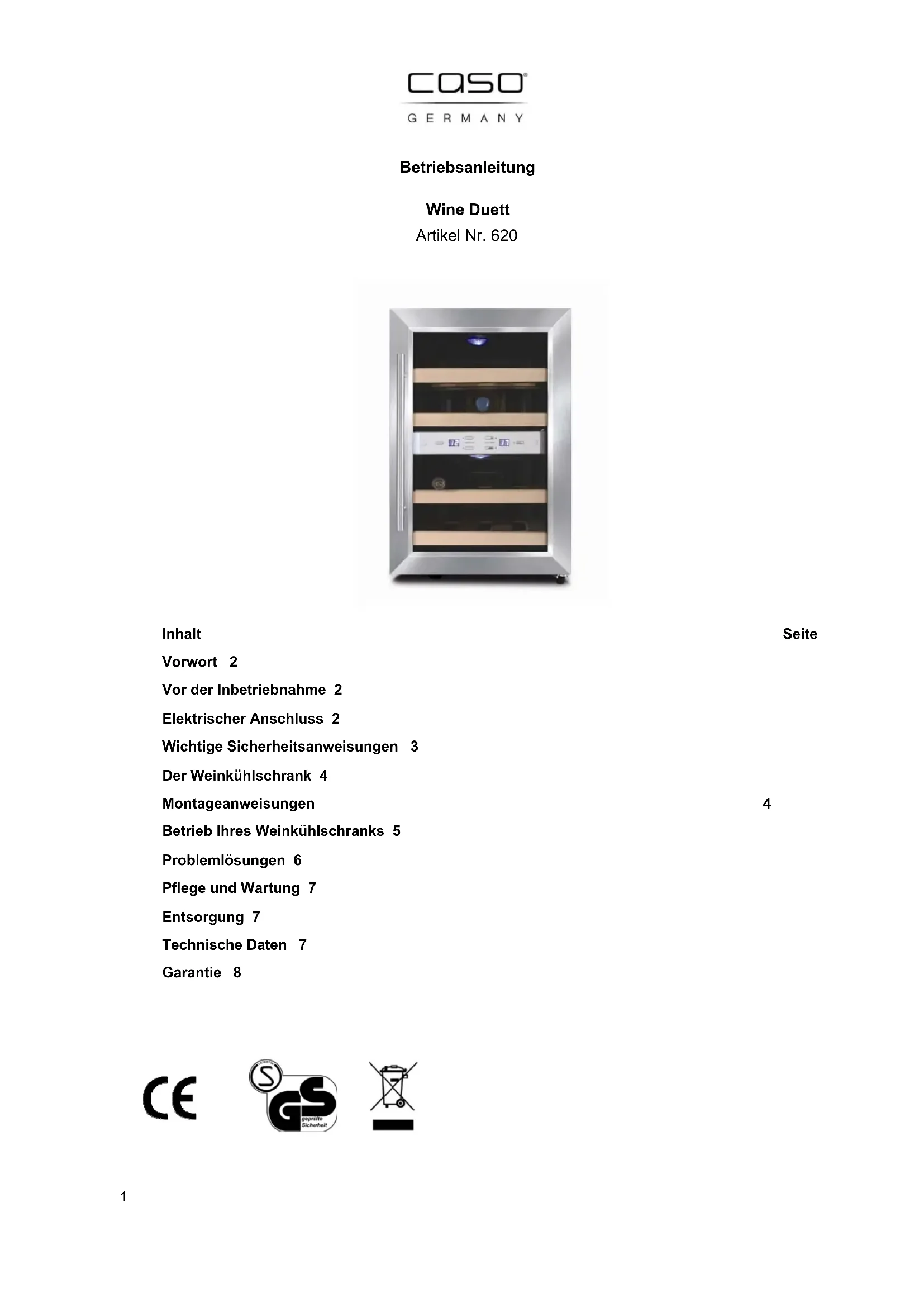 Finden Sie kostenlos die Bedienungsanleitung des Geräts Wine Duett 620 CASO als PDF.