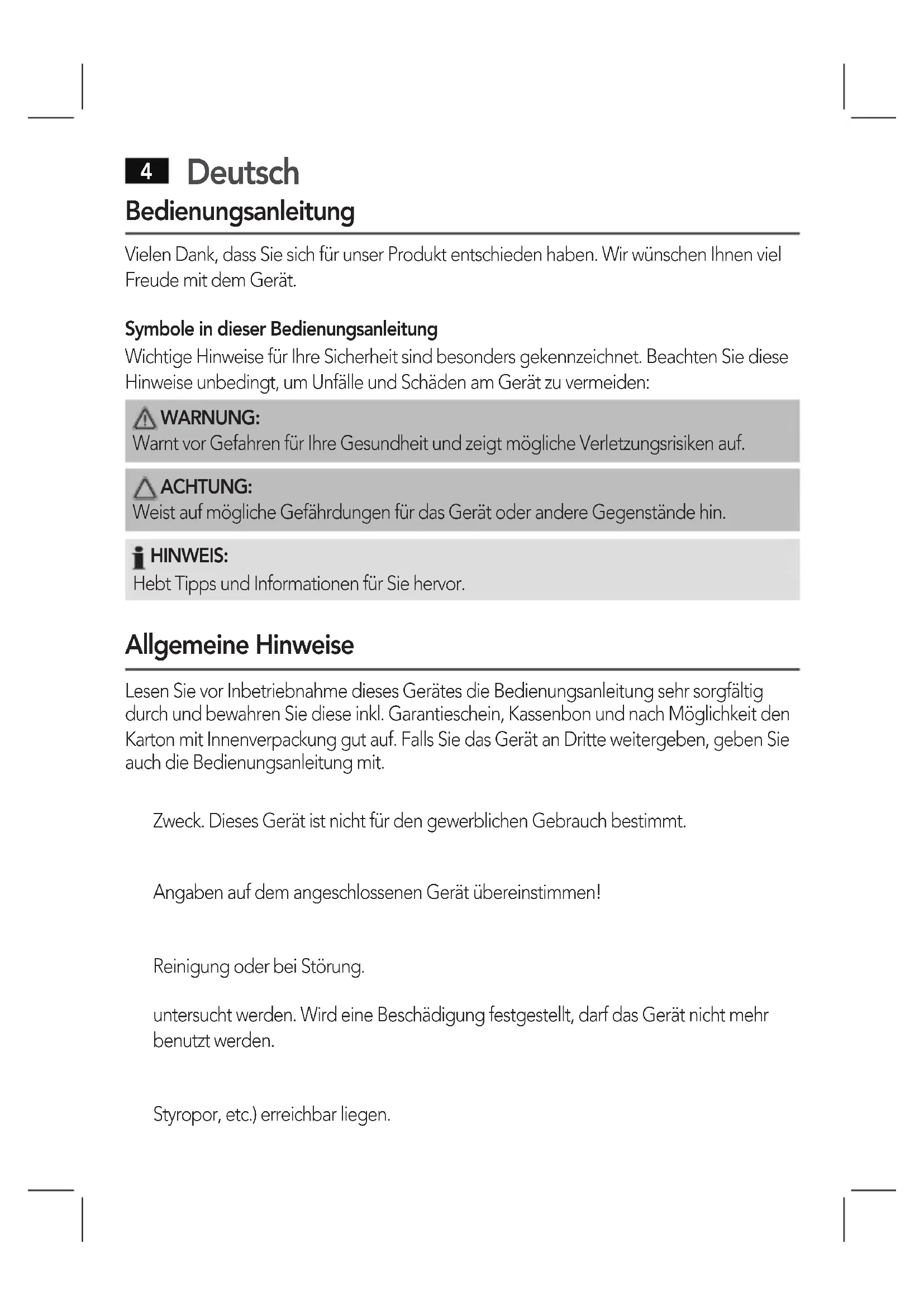 Zweck. Dieses Gerät ist nicht für den gewerblichen Gebrauch bestimmt.