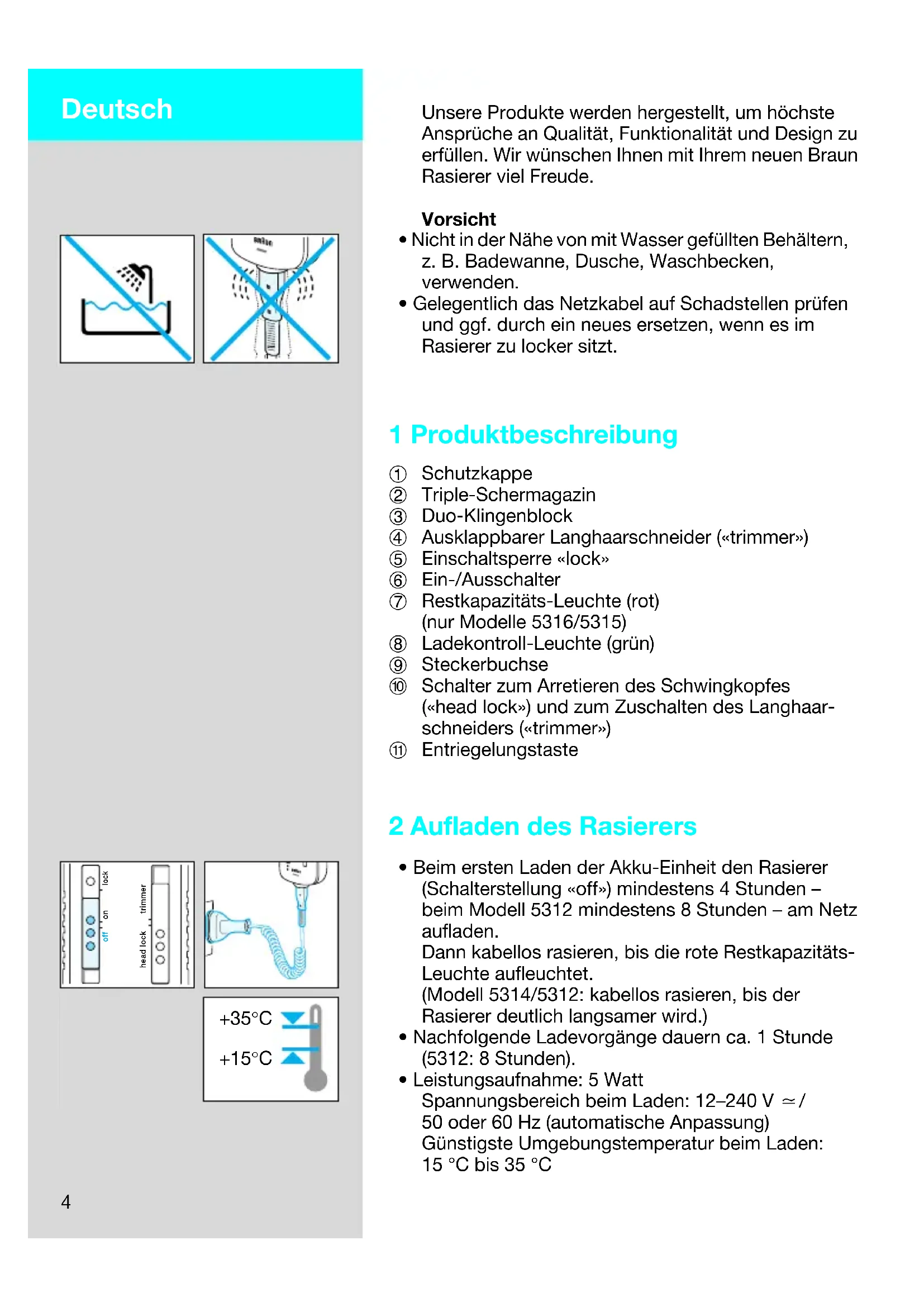 5465151_FI5312_16_S3 Seite 1 Mittwoch, 4. Dezember 2002 2:28 144 Unsere Produkte werden hergestellt, um höchste Ansprüche an Qualität, Funktionalität und Design zu erfüllen. Wir wünschen Ihnen mit Ihrem neuen Braun Rasierer viel Freude. Vorsicht