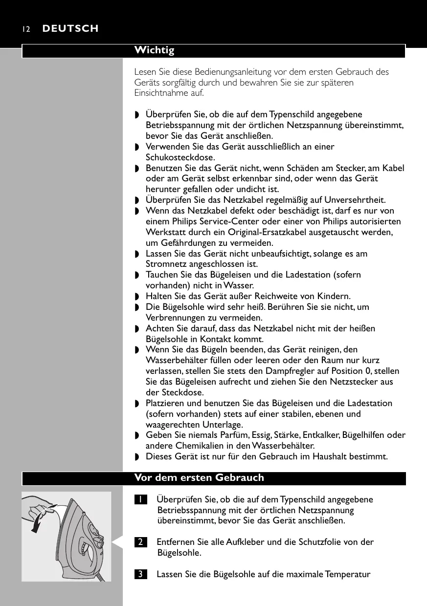 DEUTSCH Wichtig Lesen Sie diese Bedienungsanleitung vor dem ersten Gebrauch des Geräts sorgfältig durch und bewahren Sie sie zur späteren Einsichtnahme auf. ◗ Überprüfen Sie, ob die auf dem Typenschild angegebene Betriebsspannung mit der örtlichen Netzspannung übereinstimmt, bevor Sie das Gerät anschließen. ◗ Verwenden Sie das Gerät ausschließlich an einer Schukosteckdose. ◗ Benutzen Sie das Gerät nicht, wenn Schäden am Stecker, am Kabel oder am Gerät selbst erkennbar sind, oder wenn das Gerät herunter gefallen oder undicht ist. ◗ Überprüfen Sie das Netzkabel regelmäßig auf Unversehrtheit. ◗ Wenn das Netzkabel defekt oder beschädigt ist, darf es nur von einem Philips Service-Center oder einer von Philips autorisierten Werkstatt durch ein Original-Ersatzkabel ausgetauscht werden, um Gefährdungen zu vermeiden. ◗ Lassen Sie das Gerät nicht unbeaufsichtigt, solange es am Stromnetz angeschlossen ist. ◗ Tauchen Sie das Bügeleisen und die Ladestation (sofern vorhanden) nicht in Wasser. ◗ Halten Sie das Gerät außer Reichweite von Kindern. ◗ Die Bügelsohle wird sehr heiß. Berühren Sie sie nicht, um Verbrennungen zu vermeiden. ◗ Achten Sie darauf, dass das Netzkabel nicht mit der heißen Bügelsohle in Kontakt kommt. ◗ Wenn Sie das Bügeln beenden, das Gerät reinigen, den Wasserbehälter füllen oder leeren oder den Raum nur kurz verlassen, stellen Sie stets den Dampfregler auf Position 0, stellen Sie das Bügeleisen aufrecht und ziehen Sie den Netzstecker aus der Steckdose. ◗ Platzieren und benutzen Sie das Bügeleisen und die Ladestation (sofern vorhanden) stets auf einer stabilen, ebenen und waagerechten Unterlage. ◗ Geben Sie niemals Parfüm, Essig, Stärke, Entkalker, Bügelhilfen oder andere Chemikalien in den Wasserbehälter. ◗ Dieses Gerät ist nur für den Gebrauch im Haushalt bestimmt. Vor dem ersten Gebrauch