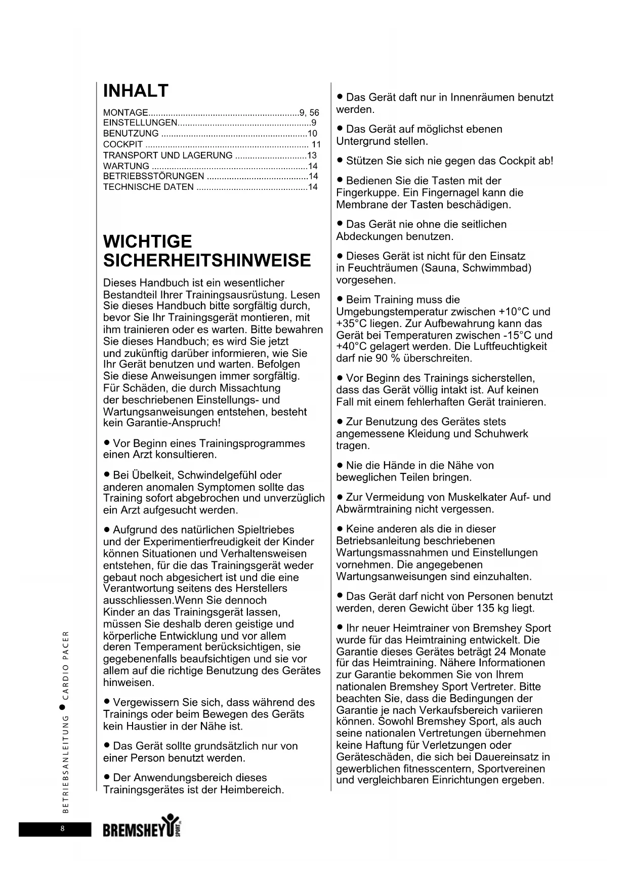- Ihr neuer Heimtrainer von Bremshey Sport wurde für das Heimtraining entwickelt. Die Garantie dieses Gerätes beträgt 24 Monate für das Heimtraining. Nähere Informationen zur Garantie bekommen Sie von Ihrem nationalen Bremshey Sport Vertreter. Bitte beachten Sie, dass die Bedingungen der Garantie je nach Verkaufsbereich variieren können. Sowohl Bremshey Sport, als auch seine nationalen Vertretungen übernehmen keine Haftung für Verletzungen oder Geräteschäden, die sich bei Dauereinsatz in gewerblichen fitnesscentern, Sportvereinen und vergleichbaren Einrichtungen ergeben.