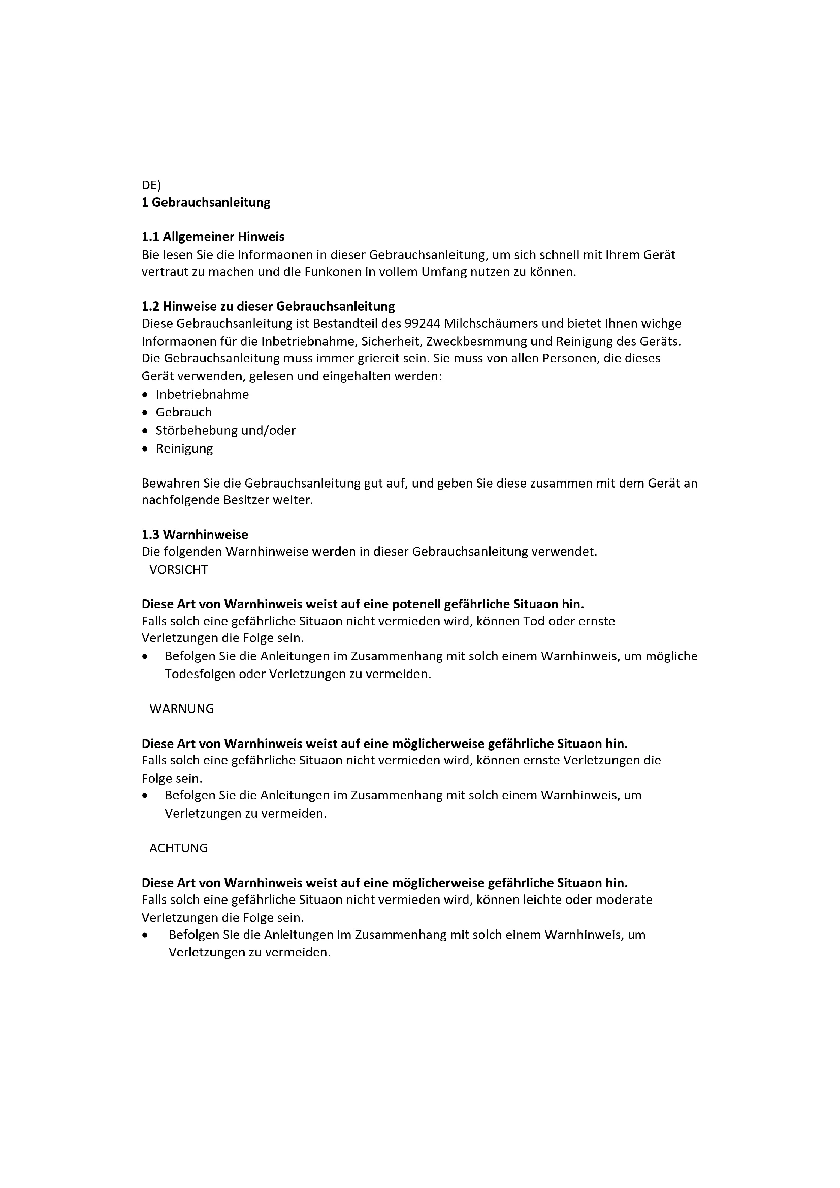 Diese Gebrauchsanleitung ist Bestandteil des 99244 Milchschäumers und bietet Ihnen wichtige Informationen für die Inbetriebnahme, Sicherheit, Zweckbestimmung und Reinigung des Geräts. Die Gebrauchsanleitung muss immer griffbereit sein. Sie muss von allen Personen, die dieses Gerät verwenden, gelesen und eingehalten werden: Inbetriebnahme Gebrauch Störbehebung und/oder Reinigung Bewahren Sie die Gebrauchsanleitung gut auf, und geben Sie diese zusammen mit dem Gerät an nachfolgende Besitzer weiter.
