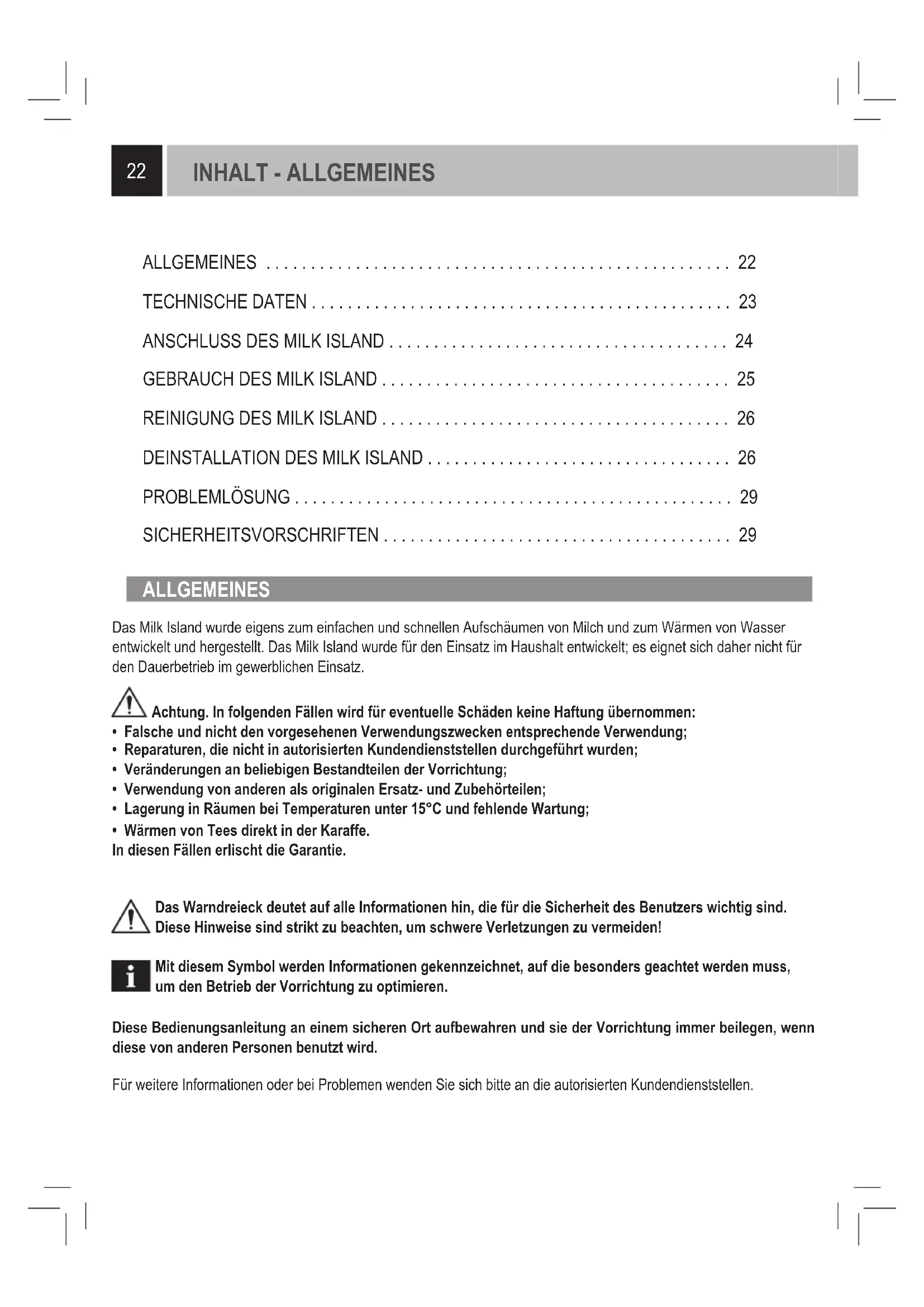 - Wärmen von Tees direkt in der Karaffe. In diesen Fällen erlischt die Garantie. Das Warndreieck deutet auf alle Informationen hin, die für die Sicherheit des Benutzers wichtig sind. Diese Hinweise sind strikt zu beachten, um schwere Verletzungen zu vermeiden! Mit diesem Symbol werden Informationen gekennzeichnet, auf die besonders geachtet werden muss, um den Betrieb der Vorrichtung zu optimieren. Diese Bedienungsanleitung an einem sicheren Ort aufbewahren und sie der Vorrichtung immer beilegen, wenn diese von anderen Personen benutzt wird. Für weitere Informationen oder bei Problemen wenden Sie sich bitte an die autorisierten Kundendienststellen. ALLGEMEINES . . . . . . . . . . . . . . . . . . . . . . . . . . . . . . . . . . . . . . . . . . . . . . . . . . . . 22 TECHNISCHE DATEN . . . . . . . . . . . . . . . . . . . . . . . . . . . . . . . . . . . . . . . . . . . . . . . 23