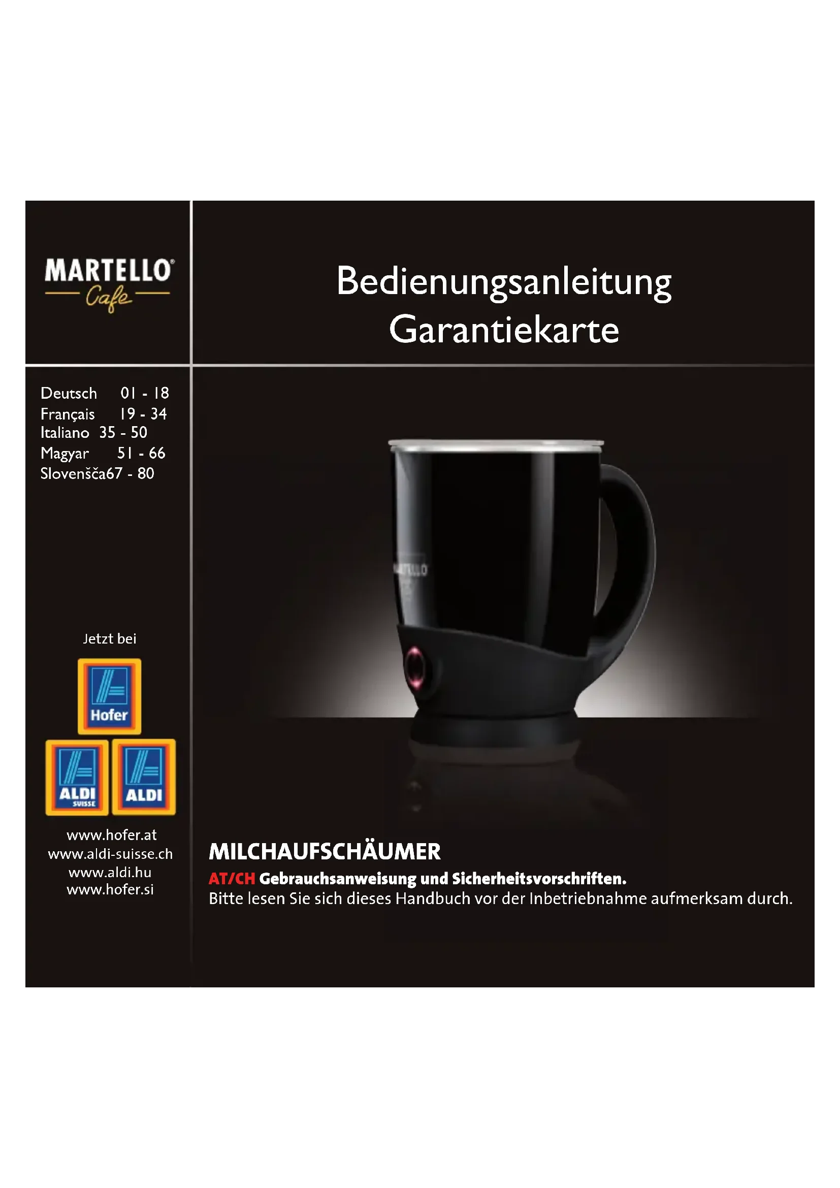 Bedienungsanleitung Garantiekarte Deutsch 01 - 18 Français 19 - 34 Italiano 35 - 50 Magyar 51 - 66 Slovenšča 67 - 80 MILCHAUFSCHÄUMER AT/CH Gebrauchsanweisung und Sicherheitsvorschriften. Bitte lesen Sie sich dieses Handbuch vor der Inbetriebnahme aufmerksam durch. Jetzt bei www.hofer.at www.aldi-suisse.ch www.aldi.hu www.hofer.si Hofer_IM_Milchschäumer_schwarz_DE_2013-09-25_Layout 1 27.09.13 12:48 Seite 1INHALTSVERZEISCHNIS Inhaltsverzeichnis Inhaltsverzeichnis ........................................ Seite 2 Sicherheitsvorschriften .............................. Seite 3-4 Gerätebeschreibung .................................. Seite 5 Erste Verwendung ...................................... Seite 6 Milch warm aufschäumen ........................ Seite 7 Milch erwärmen / mixen .......................... Seite 8 Milch kalt aufschäumen ............................ Seite 9 Aufsatz wechseln ........................................ Seite 10 Reinigung ...................................................... Seite 11 Garantie Österreich .................................... Seite 12-13 Garantie Schweiz ........................................ Seite 14-15 Entsorgungshinweise ................................ Seite 16 g DEUTSCH