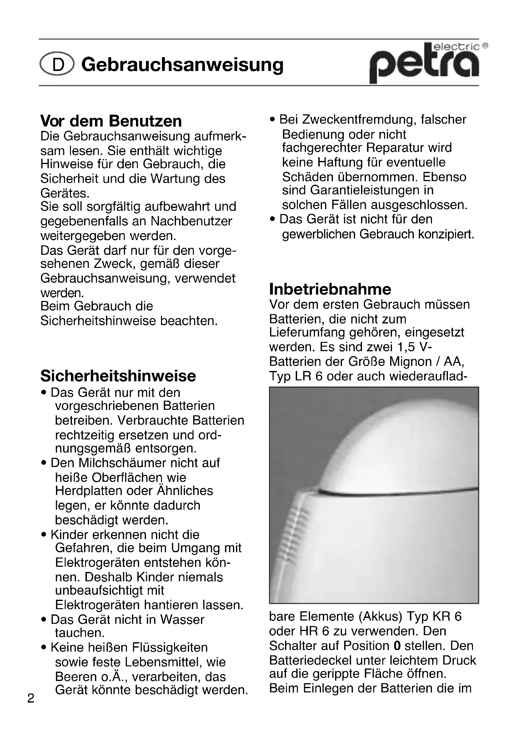 Gebrauchsanweisung DGehäuse gekennzeichnete Polarität beachten. Anschließend den Deckel aufsetzen und schließen. Die gerippten Flächen müssen übereinander liegen. Wenn die Drehzahl deutlich nach- lässt, sind die Batterien entladen und müssen ersetzt werden. Wird der Milchschäumer längere Zeit nicht benutzt, sind die Batterien aus dem Gerät zu entfernen. Verwendung Das Gerät ist zum Verarbeiten geringer Mengen von Flüssigkeiten geeignet. Die Leistung des Gerätes reicht nicht aus, um dickflüssige Lebensmittel oder größere Mengen zu verarbeiten. Vor dem ersten Gebrauch das Gerät gründlich reinigen. Um während der Verarbeitung ein Spritzen zu vermeiden, den Motor immer erst einschalten, wenn sich der Spiralbesen in der Flüssigkeit befindet. Ein Gefäß mit einem hohen Rand, wie z.B. ein Trinkglas, eignet sich deshalb am besten. Die Flüssigkeit wird sich bald nach dem Einschalten mit dem Spiralbesen im Gefäß drehen. Dies sollte durch eine entgegengesetzt kreisende Bewegung des Milchschäumers verhindert werden. Sobald der Schaum aufsteigt, den Milchschäumer nach oben bewegen, so dass der Spiralbesen immer nur knapp unterhalb der Oberfläche arbeitet. Aufschäumen von Milch Prinzipiell ist jede Milch verwendbar, jedoch kann deren Frische und Grad der Pasteurisierung das Ergebnis beeinflussen. Milch mit geringem Fettanteil lässt sich in der Regel besser aufschäumen. Ein Glas zu maximal 1/4 füllen. Nach dem Aufschäumen die Milch 1 bis 2 Minuten ruhen lassen. So erreicht der Schaum die optimale Festigkeit. Ist der Schaum abgeschöpft, kann die im Gefäß zurückgebliebene Milch erneut aufgeschäumt werden. Zubereitung von Mischgetränken Das Glas höchstens zu 2/3 füllen, da es sonst leicht überlaufen könn- te. Keine festen Zutaten, wie Beeren o.Ä., verwenden. Schlagen von Schlagsahne Maximal 100 ml gut gekühlte Sahne wie Milchschaum verarbei- ten. Zubereiten von Salatdressing Problemlos lassen sich die Zutaten in einem Glas vermischen. 3Schlagen von Eiweiß Maximal zwei Eiweiß in ein Gefäß geben. Beim Schlagen darauf ach- ten, dass der Spiralbesen immer nur dicht unter der Oberfläche arbeitet, wird er zu tief eingetaucht, sinkt die Drehzahl zu stark ab und es kommt nicht zum gewünschten Erfolg. Reinigung und Pflege Es wird empfohlen, das Gerät sofort nach jedem Gebrauch zu reinigen. Dazu am besten den Spiralbesen in ein mit Spülwasser gefülltes Glas halten und einschalten. Bei hartnäckigen, festgesetzten Verunreinigungen können die Spiralen zum Reinigen vorsichtig abgenommen werden. Das Gerät außen nur mit einem feuchten Tuch abwischen. Nach dem Reinigen den Milchschäumer im Ständer abstellen. Bei der liegenden Aufbewahrung ist darauf zu achten, dass sich der Spiralbesen nicht verbiegen kann. Garantie-Information Für unsere Geräte übernehmen wir gegenüber dem Endkunden, eine 24-monatige Haltbarkeitsgarantie. Sie beginnt mit dem Kauf des Gerätes durch den Endkunden und gilt im Gebiet der Bundesrepublik Deutschland. Ansprüche aus dieser Garantie sind unter Vorlage des Kaufbelegs direkt gegenüber unse- rem zentralen Kundendienst geltend zu machen. Von der Garantie ausgeschlossen sind Schäden durch normalen Verschleiß, unsachgemäßem Gebrauch, unterbliebener Pflege und Wartung, sowie Glasbruch. Der Endkunde hat zusätzlich zu den Ansprüchen aus dieser Garantie gesetzliche Ansprüche wegen Mängeln des Gerätes gegen- über seinem direkten Verkäufer/Händler, die durch diese Garantie nicht eingeschränkt wer- den. petra-electric Kundendienst Greisbacherstraße 6 D - 89331 Burgau www.petra-electric.de Das Gerät entspricht der EU- Richtilinie Nr. 89/336 EWG. Technische Änderungen vorbehalten. Verpackungsmaterial ordnungs- gemäß entsorgen. 4Before Using Read the instructions carefully. They contain important notes for the use, safety and maintenance of the appliance. Keep them in a safe place and transfer them to a future user. Only use the appliance for the pur- pose mentioned in these instruc- tions. When using pay particular attention to the safety advice below. Safety instructions
