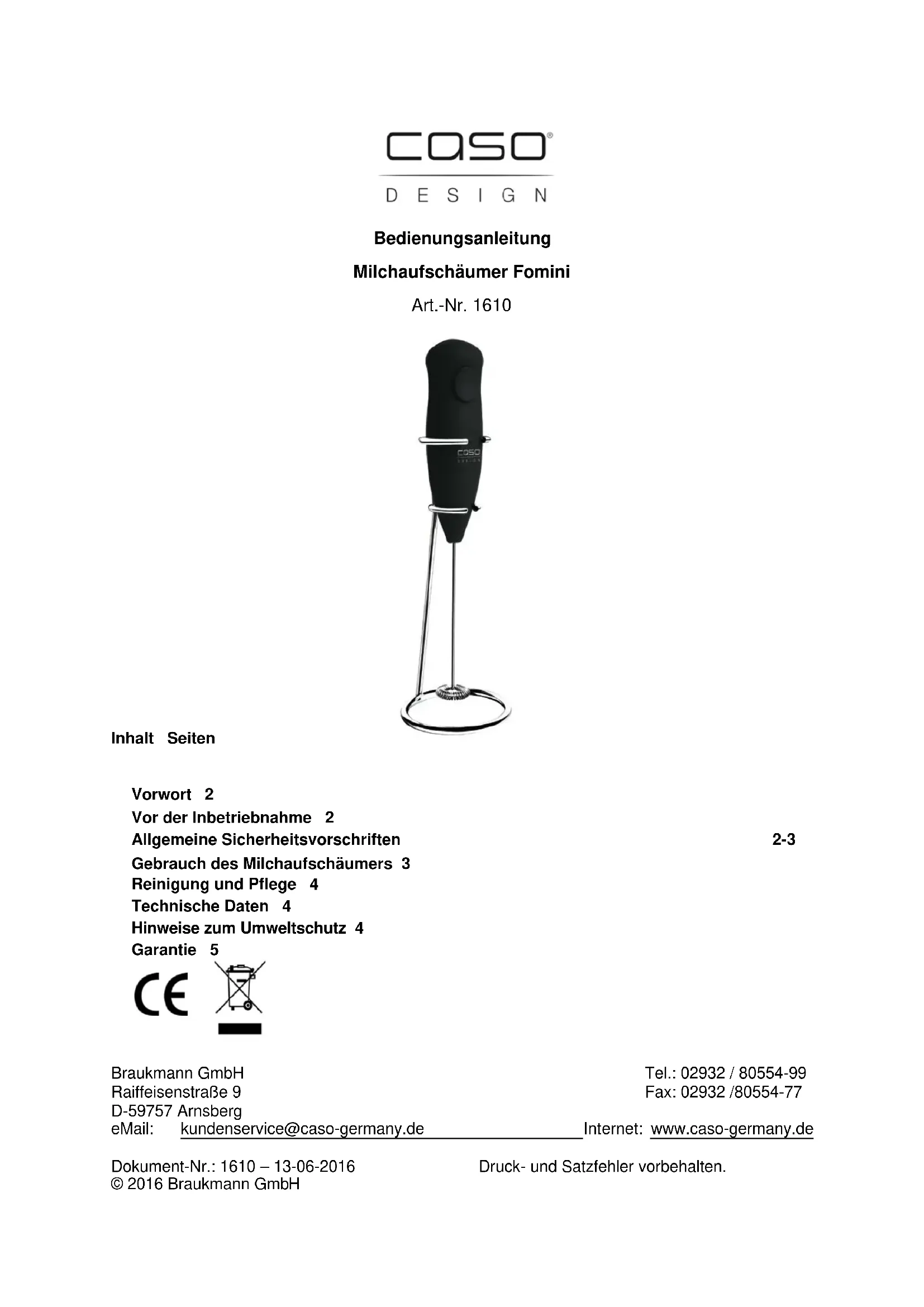 Laden Sie die Anleitung für Ihr Milchaufschäumer kostenlos im PDF-Format! Finden Sie Ihr Handbuch Fomini 1610 - CASO und nehmen Sie Ihr elektronisches Gerät wieder in die Hand. Auf dieser Seite sind alle Dokumente veröffentlicht, die für die Verwendung Ihres Geräts notwendig sind. Fomini 1610 von der Marke CASO.