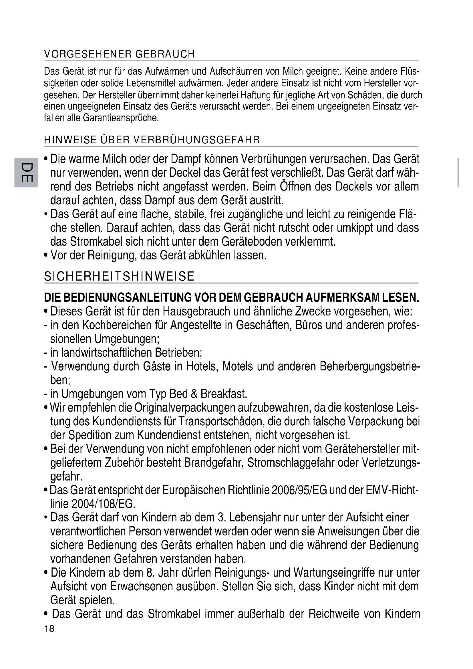 Das Gerät ist nur für das Aufwärmen und Aufschäumen von Milch geeignet. Keine andere Flüssigkeiten oder solide Lebensmittel aufwärmen. Jeder andere Einsatz ist nicht vom Hersteller vorgesehen. Der Hersteller übernimmt davon keinerlei Haftung für jegliche Art von Schäden, die durch einen ungeeigneten Einsatz des Geräts verursacht werden. Bei einem ungeeigneten Einsatz verfallen alle Garantieansprüche.