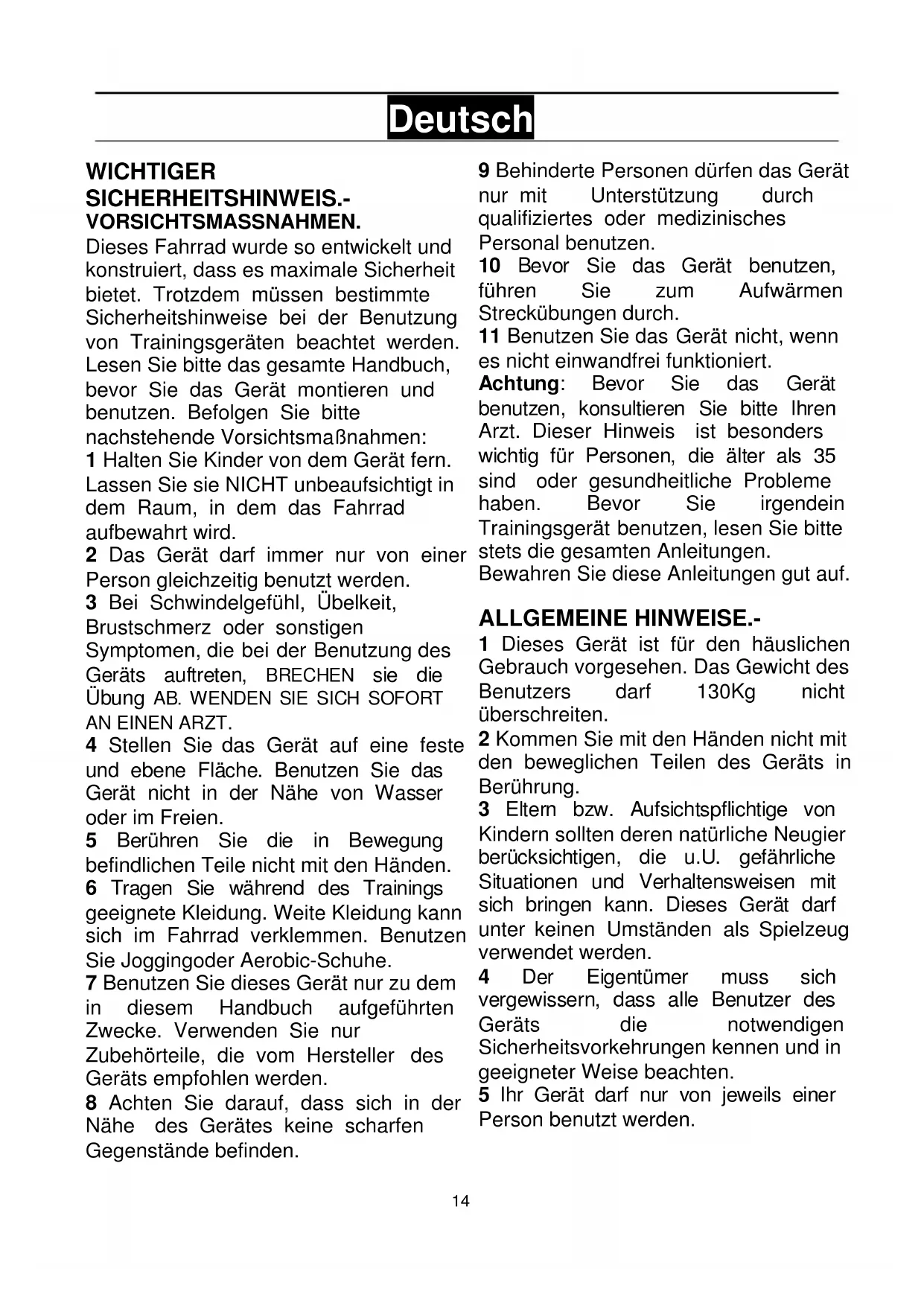 Dieses Fahrrad wurde so entwickelt und konstruiert, dass es maximale Sicherheit bietet. Trotzdem müssen bestimmte Sicherheitshinweise bei der Benutzung von Trainingsgeräten beachtet werden. Lesen Sie bitte das gesamte Handbuch, bevor Sie das Gerät montieren und benutzen. Befolgen Sie bitte nachstehende Vorsichtsmaßnahmen: