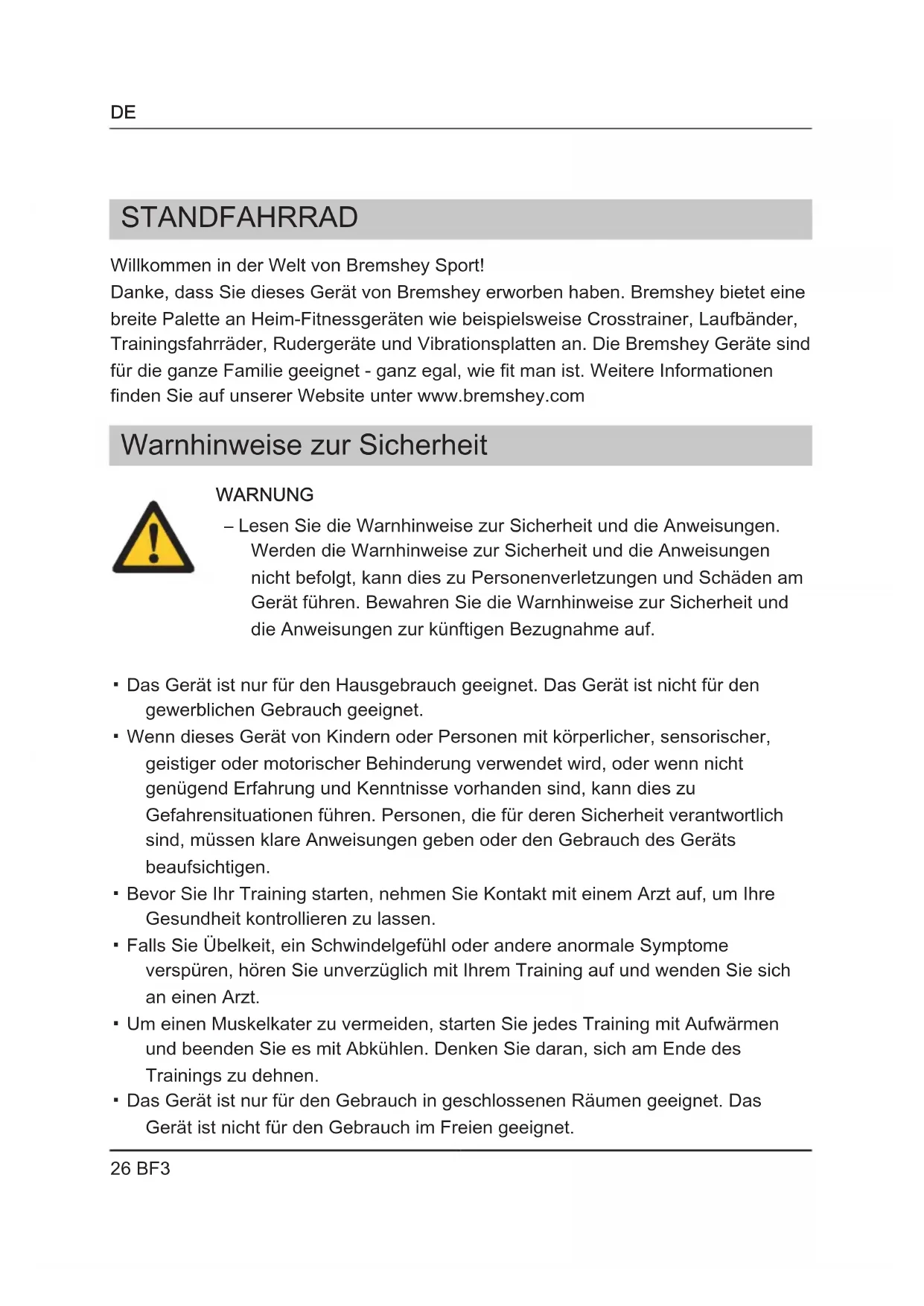 Danke, dass Sie diesen Gerät von Bremshey erworben haben. Bremshey bietet eine breite Palette an Heim-Fitnessgeräten wie beispielsweise Crosstrainer, Laufbänder, Trainingsfahrräder, Rudergeräte und Vibrationsplatten an. Die Bremshey Geräte sind für die ganze Familie geeignet - ganz egal, wie fit man ist. Weitere Informationen finden Sie auf unserer Website unter www.bremshey.com