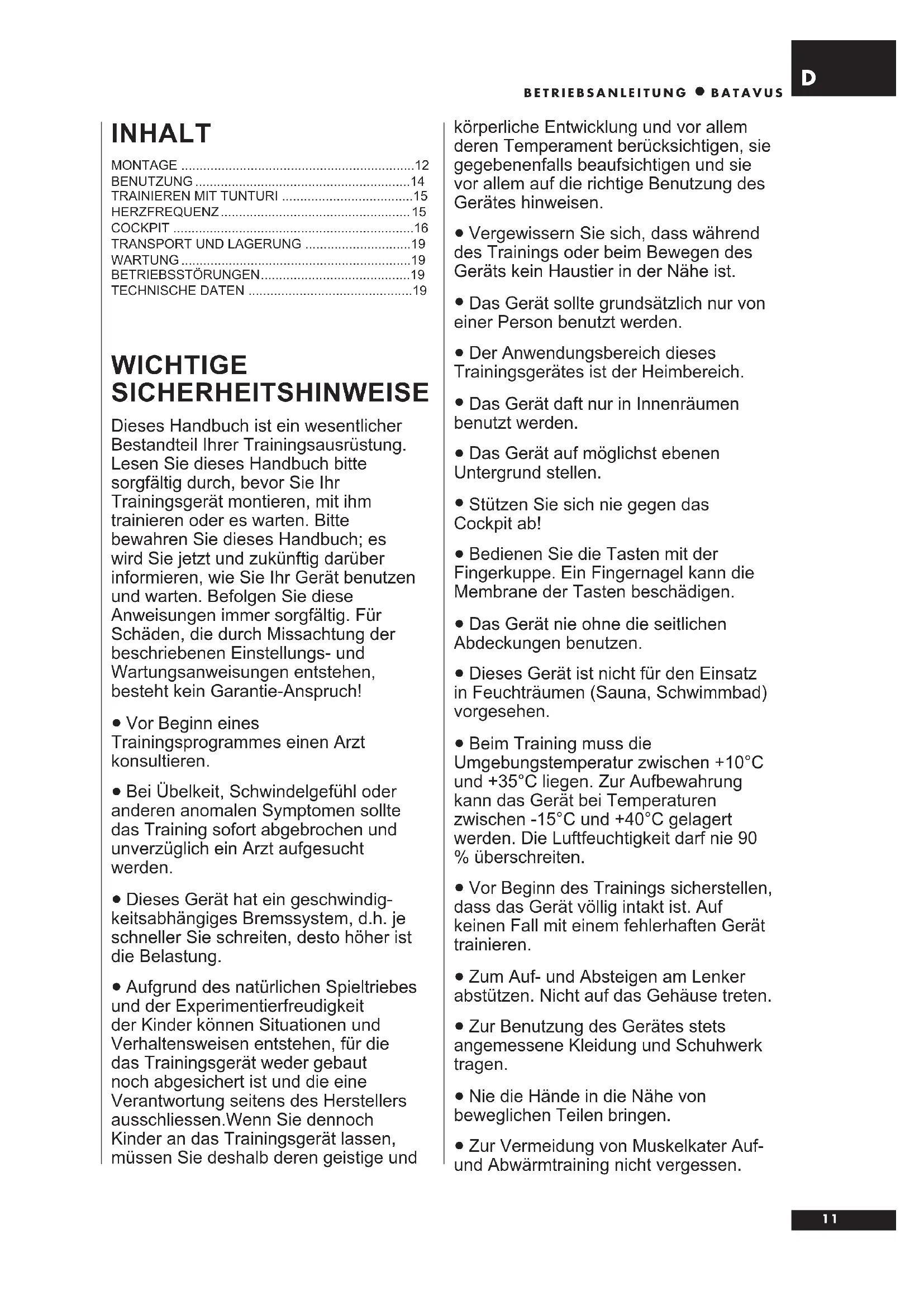 - Ihr neuer Heimtrainer von Batavus wurde für das Heimtraining entwickelt. Die Garantie these Gerätes beträgt 24 Monate für das Heimtraining. Nähere Informationen zur Garantie besteht dem Sie von Ihrem nationalen Batavus Vertreter.itte beachten Sie, dass die Bedingungen der Garantie je nach Verkaufsbereich variieren können. Sowohl Batavus Sport, als auch seine nationalen Vertretungen übernehmen keine Haftung fur Verletzungen oder Geräteschäden, die sich bei Dauereinsatz in gewerblichen Fitnesscentern, Sportvereinen und vergleichbaren Einrichtungen ergeben.