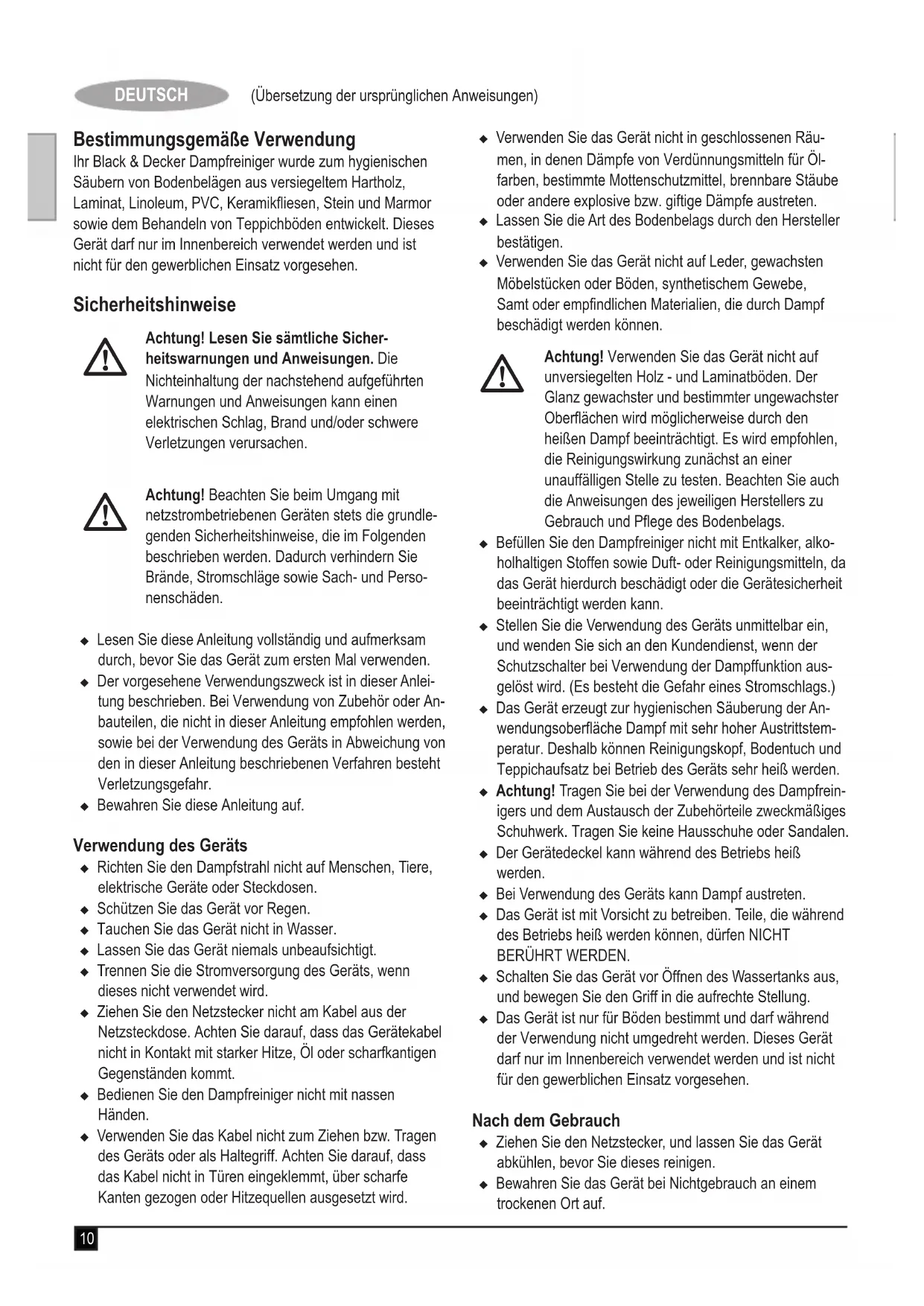 Ihr Black & Decker Dampfreiniger wurde zum hygienischen Säubern von Bodenbelägen aus versiegeltem Hartholz, Laminat, Linoleum, PVC, Keramikfliesen, Stein und Marmor sowie dem Behandeln von Teppichböden entwickelt. Dieses Gerätarf nur im Innbereich verwendet werden und ist nicht für den gewerblichen Einsatz vorgesehen.