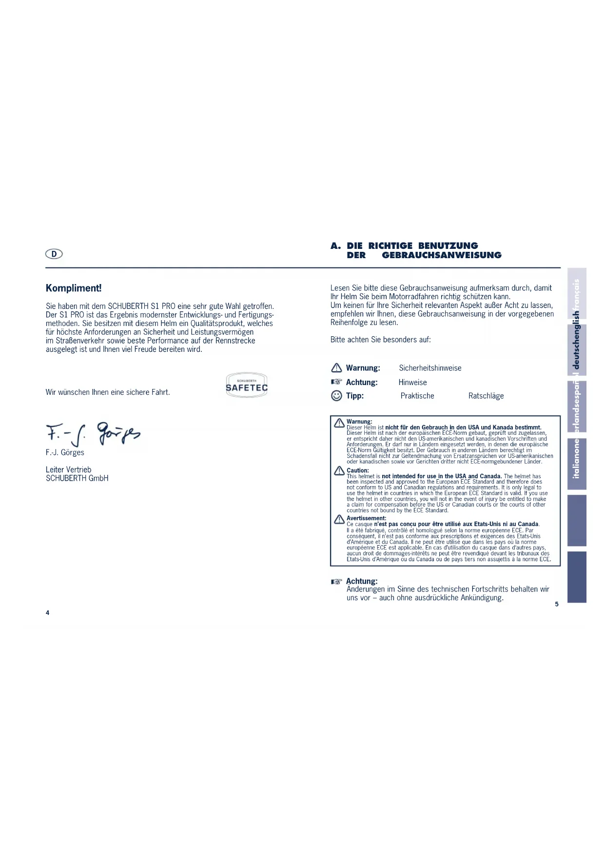 Ce casque n’est pas conçu pour être utilisé aux Etats-Unis ni au Canada. Il a été fabriqué, contrôlé et homologué selon la norme européenne ECE. Par conséquent, il n’est pas conforme aux prescriptions et exigences des Etats-Unis d’Amérique et du Canada. Il ne peut être utilisé que dans les pays où la norme européenne ECE est applicable. En cas d’utilisation du casque dans d‘autres pays, aucun droit de dommages-intérêts ne peut être revendiqué devant les tribunaux des Etats-Unis d’Amérique ou du Canada ou de pays tiers non assujettis à la norme ECE. Achtung: Änderungen im Sinne des technischen Fortschritts behalten wir uns vor – auch ohne ausdrückliche Ankündigung. Kompliment! Sie haben mit dem SCHUBERTH S1 PRO eine sehr gute Wahl getroffen. Der S1 PRO ist das Ergebnis modernster Entwicklungs- und Fertigungs- methoden. Sie besitzen mit diesem Helm ein Qualitätsprodukt, welches für höchste Anforderungen an Sicherheit und Leistungsvermögen im Straßenverkehr sowie beste Performance auf der Rennstrecke ausgelegt ist und Ihnen viel Freude bereiten wird. Wir wünschen Ihnen eine sichere Fahrt. F.-J. Görges Leiter Vertrieb SCHUBERTH GmbH
