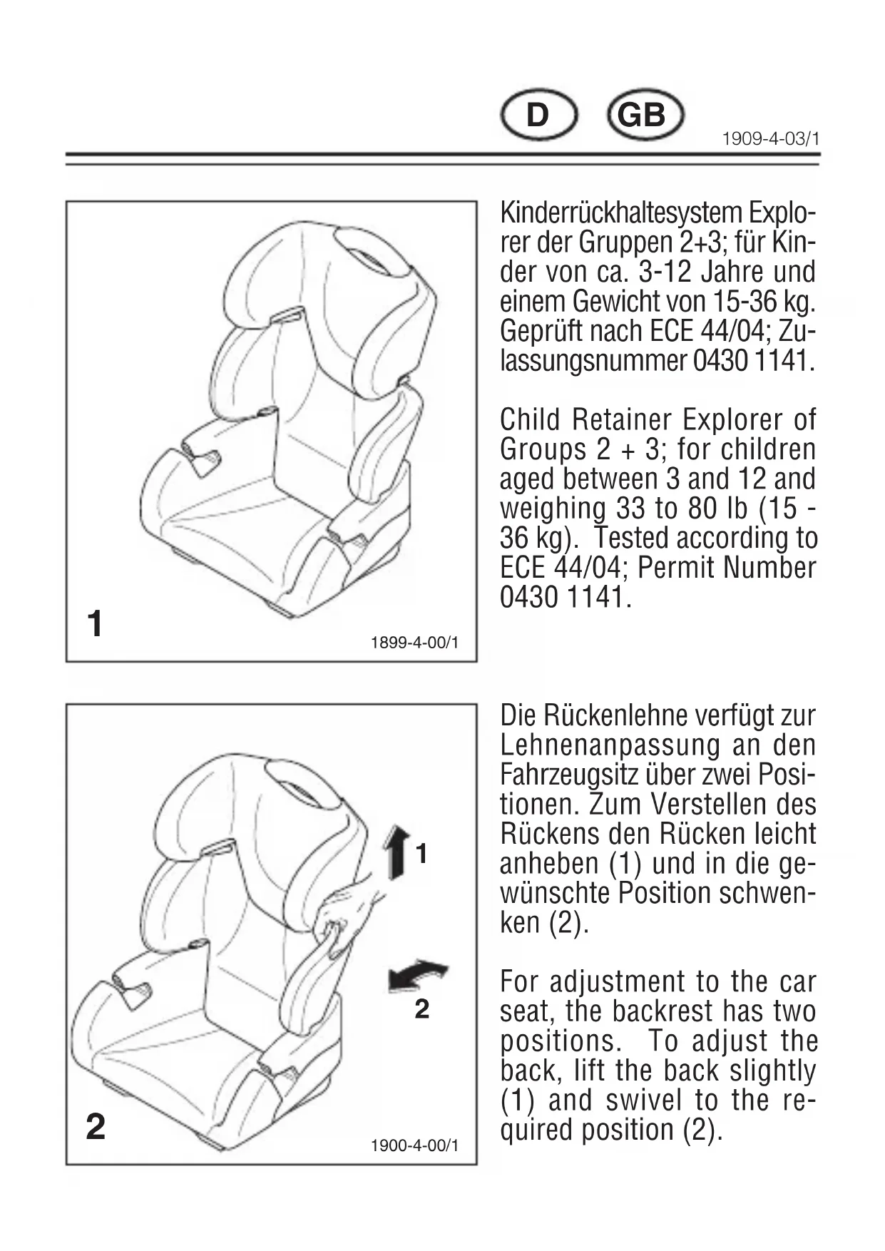 Kinderrückhaltesystem Explorer der Gruppen 2+3; für Kinder von ca. 3-12 Jahre und einem Gewicht von 15-36 kg. Geprüft nach ECE 44/04; Zulassungsnummer 0430 1141.