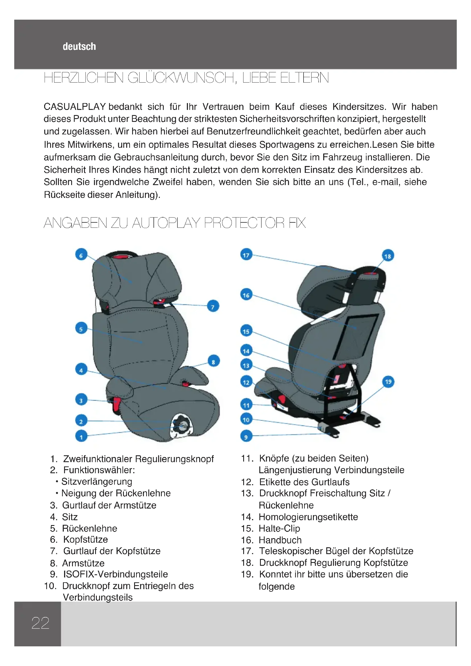 CASUALPLAY bedankt sich für Ihr Vertrauen beim Kauf dieses Kindersitzes. Wir haben dieses Produkt unter Beachtung der striktesten Sicherheitsvorschriften konzipiert, hergestellt und zugelassen. Wir haben hierbei auf Benutzerfreundlichkeit geachtet, bedürfen aber auch Ihres Mitwirkens, um ein optimales Resultat dieses Sportwagens zu erreichen.Lesen Sie bitte aufmerksam die Gebrauchsanleitung durch, bevor Sie den Sitz im Fahrzeug installieren. Die Sicherheit Ihres Kindes hängt nicht zuletzt von dem korrekten Einsatz des Kindersitzes ab. Sollten Sie irgendwelche Zweifel haben, wenden Sie sich bitte an uns (Tel., e-mail, siehe Rückseite dieser Anleitung).