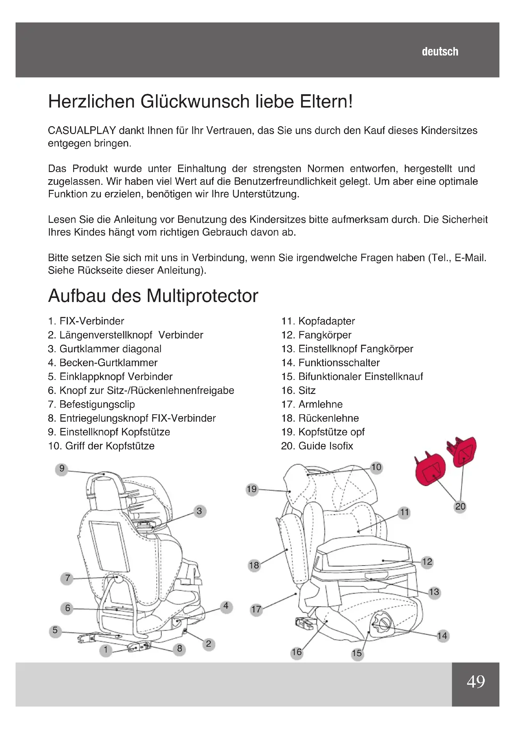 Herzlichen Glückwunsch liebe Eltern! CASUALPLAY dankt Ihnen für Ihr Vertrauen, das Sie uns durch den Kauf dieses Kindersitzes entgegen bringen. Das Produkt wurde unter Einhaltung der strengsten Normen entworfen, hergestellt und zugelassen. Wir haben viel Wert auf die Benutzerfreundlichkeit gelegt. Um aber eine optimale Funktion zu erzielen, benötigen wir Ihre Unterstützung. Lesen Sie die Anleitung vor Benutzung des Kindersitzes bitte aufmerksam durch. Die Sicherheit Ihres Kindes hängt vom richtigen Gebrauch davon ab. Bitte setzen Sie sich mit uns in Verbindung, wenn Sie irgendwelche Fragen haben (Tel., E-Mail. Siehe Rückseite dieser Anleitung). Aufbau des Multiprotector deutsch50 WICHTIg Der Kindersitz ist ausschließlich zum Einsatz in Fahrzeugen geeignet, die einen Dreipunkt-Sicherheitsgurt mit Gurtstraffer besitzen, der der UN/ECE-16 Regelung oder einer anderen gleichwertigen Norm entspricht. WARNUNg