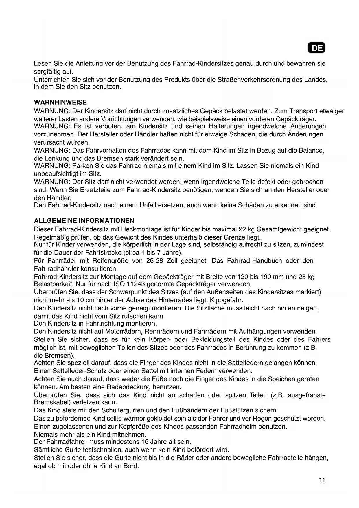 FR11 Lesen Sie die Anleitung vor der Benutzung des Fahrrad-Kindersitzes genau durch und bewahren sie sorgfältig auf. Unterrichten Sie sich vor der Benutzung des Produkts über die Straßenverkehrsordnung des Landes, in dem Sie den Sitz benutzen. WARNHINWEISE WARNUNG: Der Kindersitz darf nicht durch zusätzliches Gepäck belastet werden. Zum Transport etwaiger weiterer Lasten andere Vorrichtungen verwenden, wie beispielsweise einen vorderen Gepäckträger. WARNUNG: Es ist verboten, am Kindersitz und seinen Halterungen irgendwelche Änderungen vorzunehmen. Der Hersteller oder Händler haften nicht für etwaige Schäden, die durch Änderungen verursacht wurden. WARNUNG: Das Fahrverhalten des Fahrrades kann mit dem Kind im Sitz in Bezug auf die Balance, die Lenkung und das Bremsen stark verändert sein. WARNUNG: Parken Sie das Fahrrad niemals mit einem Kind im Sitz. Lassen Sie niemals ein Kind unbeaufsichtigt im Sitz. WARNUNG: Der Sitz darf nicht verwendet werden, wenn irgendwelche Teile defekt oder gebrochen sind. Wenn Sie Ersatzteile zum Fahrrad-Kindersitz benötigen, wenden Sie sich an den Hersteller oder den Händler. Den Fahrrad-Kindersitz nach einem Unfall ersetzen, auch wenn keine Schäden zu erkennen sind. ALLGEMEINE INFORMATIONEN Dieser Fahrrad-Kindersitz mit Heckmontage ist für Kinder bis maximal 22 kg Gesamtgewicht geeignet. Regelmäßig prüfen, ob das Gewicht des Kindes unterhalb dieser Grenze liegt. Nur für Kinder verwenden, die körperlich in der Lage sind, selbständig aufrecht zu sitzen, zumindest für die Dauer der Fahrtstrecke (circa 1 bis 7 Jahre). Für Fahrräder mit Reifengröße von 26-28 Zoll geeignet. Das Fahrrad-Handbuch oder den Fahrradhändler konsultieren. Fahrrad-Kindersitz zur Montage auf dem Gepäckträger mit Breite von 120 bis 190 mm und 25 kg Belastbarkeit. Nur für nach ISO 11243 genormte Gepäckträger verwenden. Überprüfen Sie, dass der Schwerpunkt des Sitzes (auf den Außenseiten des Kindersitzes markiert) nicht mehr als 10 cm hinter der Achse des Hinterrades liegt. Kippgefahr. Den Kindersitz nicht nach vorne geneigt montieren. Die Sitzäche muss leicht nach hinten neigen, damit das Kind nicht vom Sitz rutschen kann. Den Kindersitz in Fahrtrichtung montieren. Den Kindersitz nicht auf Motorrädern, Rennrädern und Fahrrädern mit Aufhängungen verwenden. Stellen Sie sicher, dass es für kein Körper- oder Bekleidungsteil des Kindes oder des Fahrers möglich ist, mit beweglichen Teilen des Sitzes oder des Fahrrades in Berührung zu kommen (z.B. die Bremsen). Achten Sie speziell darauf, dass die Finger des Kindes nicht in die Sattelfedern gelangen können. Einen Sattelfeder-Schutz oder einen Sattel mit internen Federn verwenden. Achten Sie auch darauf, dass weder die Füße noch die Finger des Kindes in die Speichen geraten können. Am besten eine Radabdeckung benutzen. Überprüfen Sie, dass sich das Kind nicht an scharfen oder spitzen Teilen (z.B. ausgefranste Bremskabel) verletzen kann. Das Kind stets mit den Schultergurten und den Fußbändern der Fußstützen sichern. Das zu befördernde Kind sollte wärmer gekleidet sein als der Fahrer und vor Regen geschützt werden. Einen zugelassenen und zur Kopfgröße des Kindes passenden Fahrradhelm benutzen. Niemals mehr als ein Kind mitnehmen. Der Fahrradfahrer muss mindestens 16 Jahre alt sein. Sämtliche Gurte festschnallen, auch wenn kein Kind befördert wird. Stellen Sie sicher, dass die Gurte nicht bis in die Räder oder andere bewegliche Fahrradteile hängen, egal ob mit oder ohne Kind an Bord. DE12 Den Kindersitz nicht in der Sonne stehen lassen: Die Kunststoffteile des Kindersitzes heizen sich in der Sonne auf. Ihr Kind kann sich daran verbrennen. Wird das Fahrrad z. B. auf einem Autodach, auf einem Anhänger oder hinter einem Wohnmobil transportiert, so ist der Kindersitz vorher abzunehmen. Der sehr hohe Luftwiderstand kann zu Schäden am Fahrrad und Kindersitz führen und letztlich sogar Unfälle verursachen. Das Fahrrad regelmäßig kontrollieren: Reifen, Bremsen, Beleuchtung etc. Den Kindersitz regelmäßig mit einer Seifenlösung waschen. Keine aggressiven Reinigungsmittel verwenden.