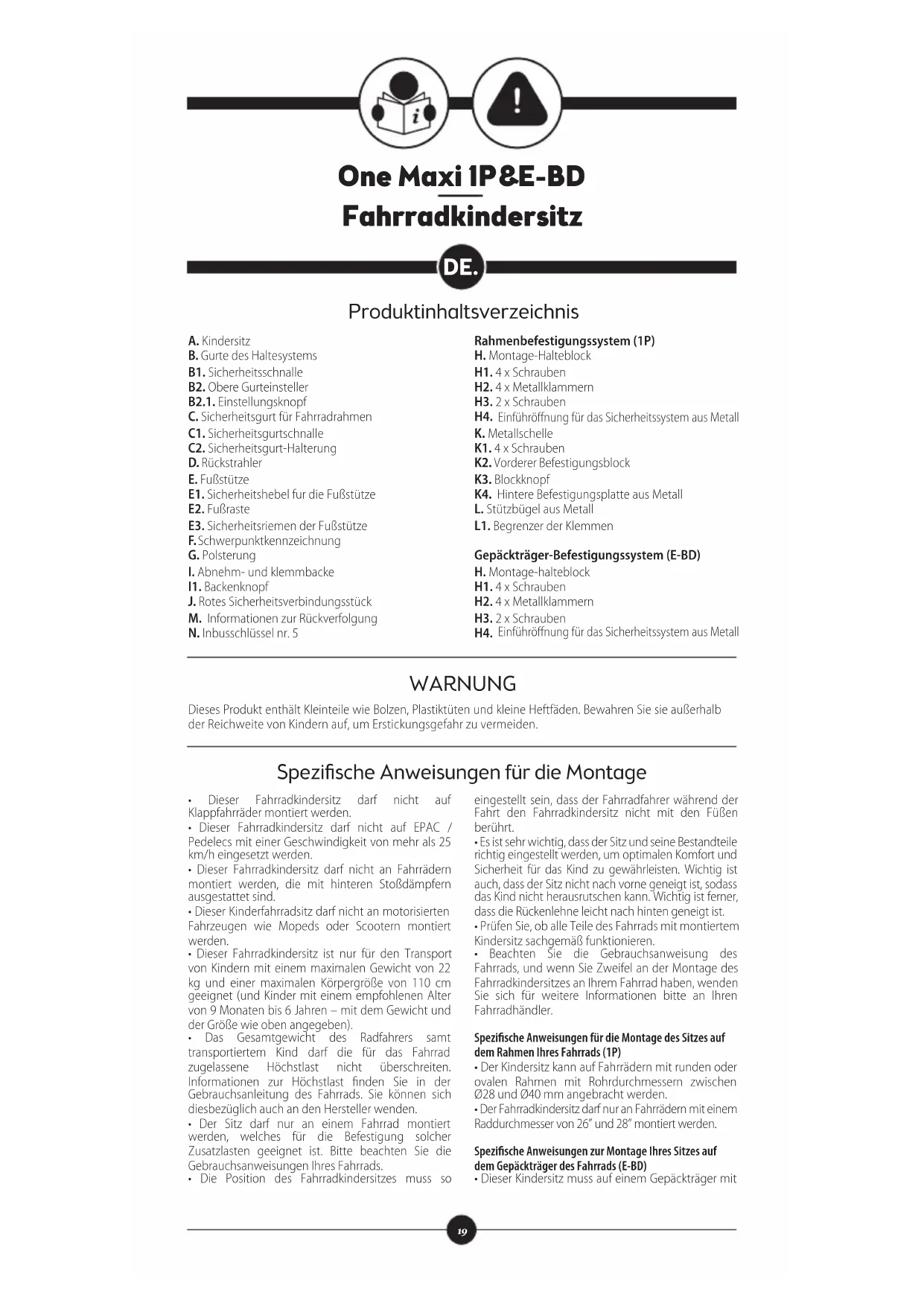 - Dieser Kindersitz muss auf einem Gepäckträger mit Produktinhaltsverzeichnis Spezifische Anweisungen für die Montage Dieses Produkt enthält Kleinteile wie Bolzen, Plastiktüten und kleine Heftfäden. Bewahren Sie sie außerhalb der Reichweite von Kindern auf, um Erstickungsgefahr zu vermeiden. WARNUNG One Maxi 1P&E-BD Fahrradkindersitz20 einer Tragfähigkeit von mindestens 27 kg, gemäß Norm EN ISO 11243:2016.