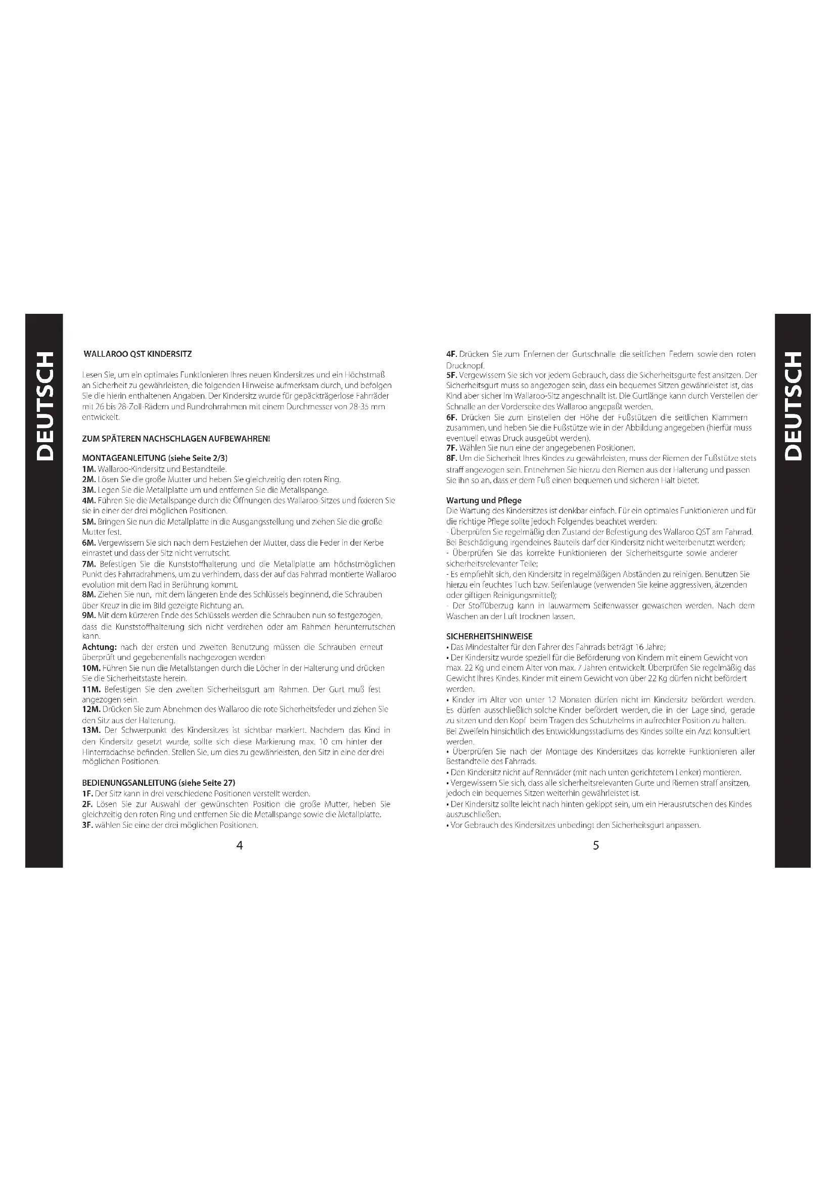 - Überprüfen Sie regelmäßig den Zustand der Befestigung des Wallaroo QST am Fahrrad. Bei Beschädigung irgendeines Bauteils darf der Kindersitz nicht weiterbenutzt werden;