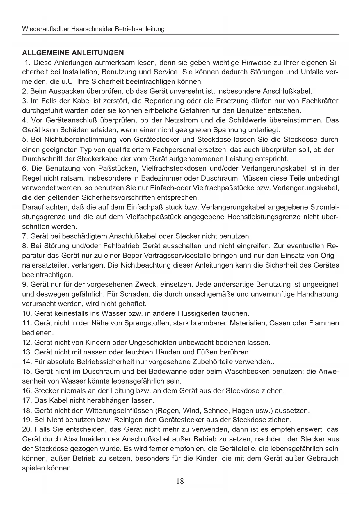 Eine gute Reinigung und Pflege gewährleisten eine optimale Leistung und eine bessere Wartung des Geräts. Haarschneider bei Beschädigungen bzw. Fehlstörungen nicht benutzen. Wenden Sie sich an den Hersteller oder an qualifizierte Fachkräften.