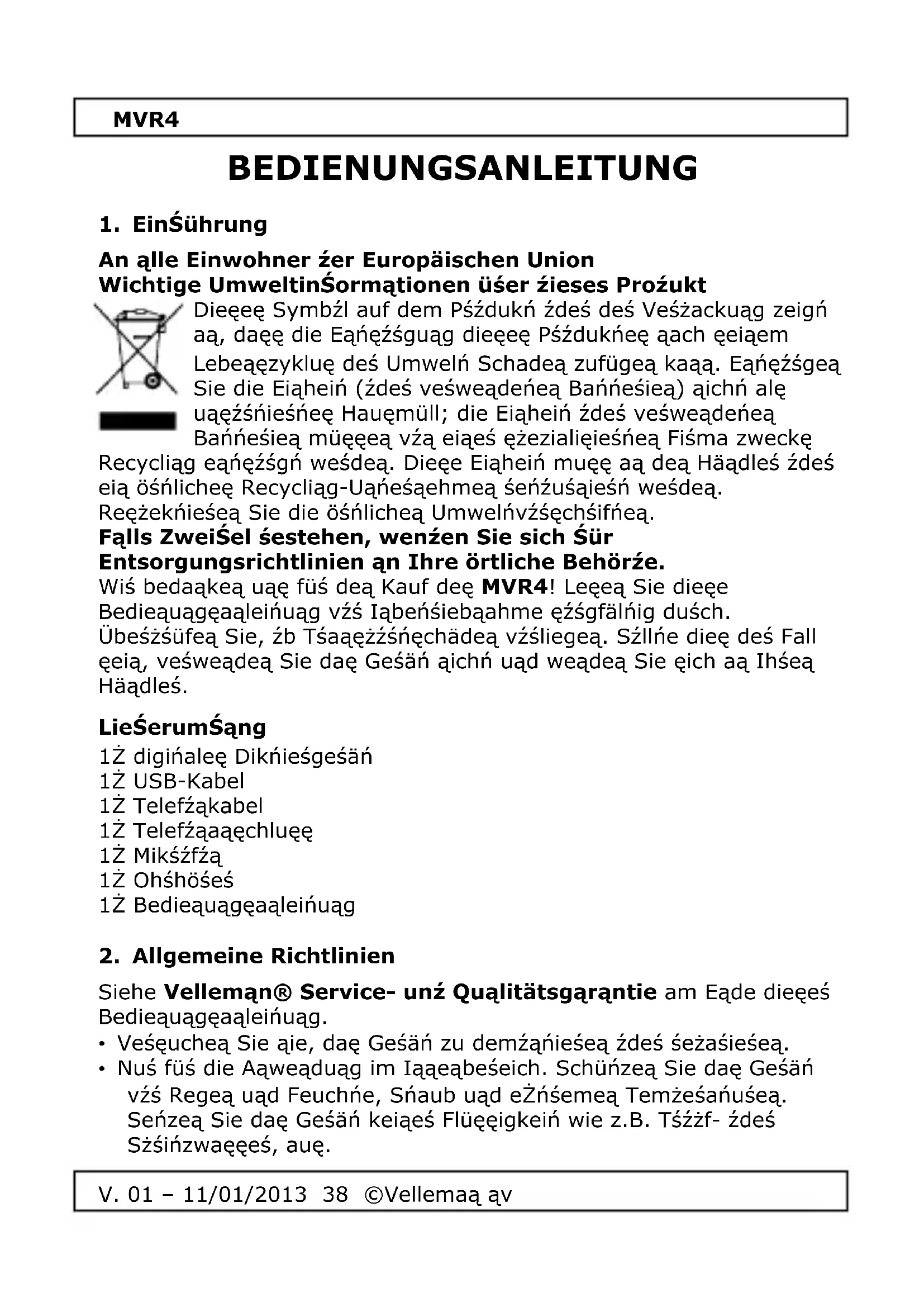Verwenzen Sie zieses Gerät nur mit originellen Zuşehirteilen. Vellemän NV üsernimmt keine Haštung Sür Schäzen ozer Verletzungen sei (Salscher) Anwenzung zieses Gerätes. Für mehr InSormaționen zu diesem Prożukt unź zie neueste Version zieser Bezienungsanleitung, siehe www.vellemän.eu. Alle Änzerungen ohne vorherige Ankünzigung vorsehalten.