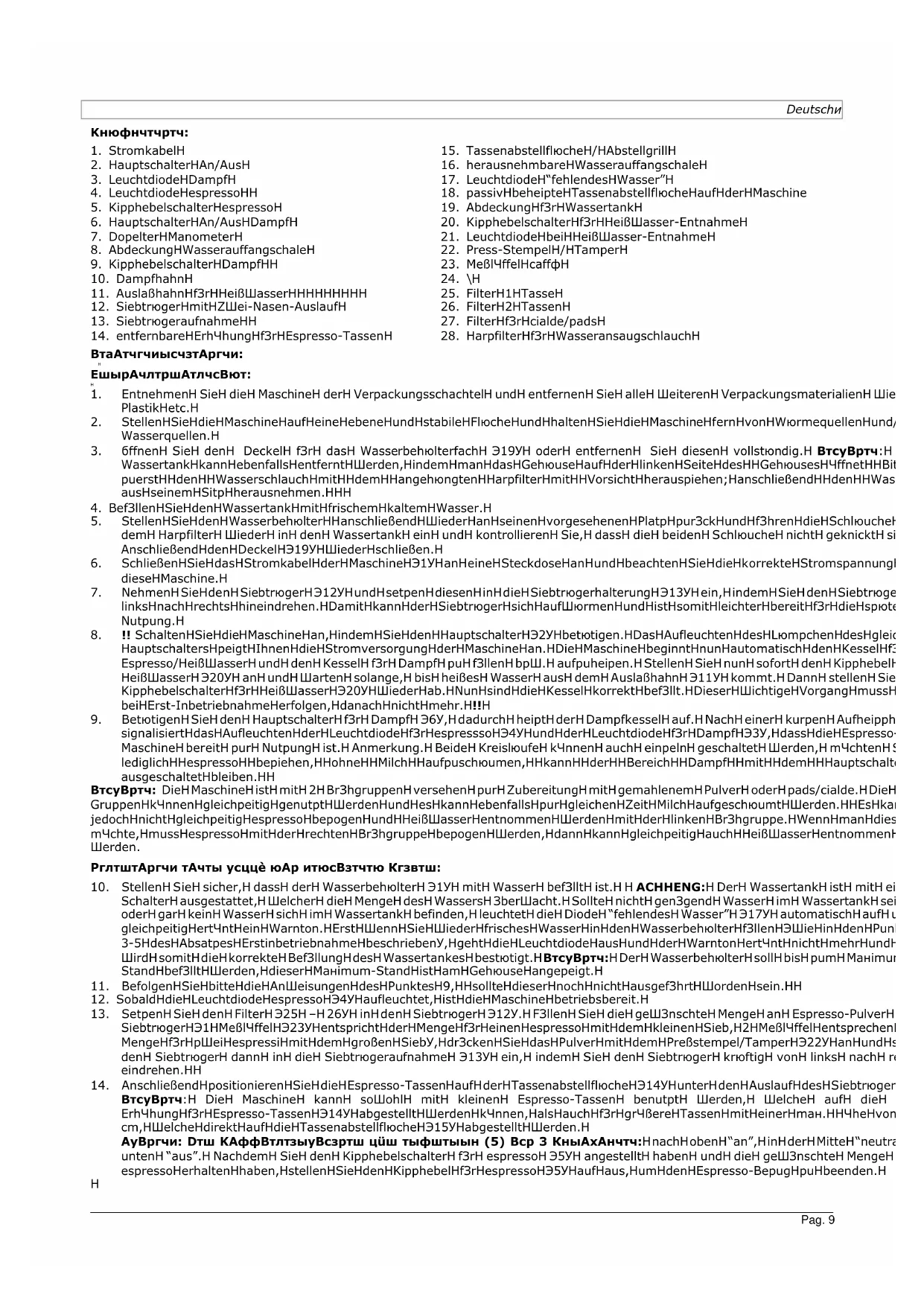 gegebenenfalls diesen wieder zu befüllen wie in Punkt 24 beschrieben. GRUNDSÄTZLICHE PFLEGEHINWEISE UND VORSICHTSMAßNAHMEN: - Es empfiehlt sich, die Dampflanze (10) nach jeder Benutzung zu reinigen. - Für die Reinigung der Maschine ein weiches feuchtes Tuch benutzen. - Die Maschine keinen atmosphärischen Störungen aussetzen. - Die Maschine niemals in Wasser tauchen. - Die Maschine darf nur unter Kontrolle von Erwachsenen bedient werden und muss von Kindern ferngehalten werden. - Den Siebträger und die Filter nicht in der Geschirrspülmaschine reinigen. - Während des Betriebes der Maschine kann diese an verschiedenen Teilen sehr heiß werden; bitte lassen Sie große Vorsicht walten!! Beachten: Die Maschine ist mit einem Wasserbehälter mit einem Fassungsvermögen von 2,7 Liter ausgestattet, gekoppelt mit einem Wasserstandsmelder, der bei Wassermangel mit einer Leuchtdiode (17) und einem akustischen Warnton reagiert. Der Klang des Warntons, der beim Einschalten der Maschine bei Wassermangel ertönt, unterscheidet sich vom Warnton, der im normalen Betrieb der Maschine ertönt. Sollte der Warnton nicht beenden auch wenn es noch Wasser in Behälter gibt, überprüfen Sie dass der Wasserbehälter korrekt in seinem Sitz posizioniert wurde. Das Wieder-Auffüllen des Wasserbehälters beendet sowohl das Aufleuchten der Leuchtdiode für Wassermangel (17) als auch den Warnton. Wenn das Wasser während des normalen Betriebes ausgeht, bedeutet das Aufleuchten/der Warnton noch eine Zeit von ca. 15 Sekunden zum Beendigen des caffè. Wenn der Bezug des espresso beendet ist, empfiehlt es sich, den Wassertank wieder bis maximal aufzufüllen. Es wird darum gebeten, die Bedienungsanleitung aufmerksam zu lesen und regelmäßig den Wasserstand im Wasserbehälter zu kontrollieren. Harzfilter (montiert auf dem Ansaugschlauch im Inneren des Wasserbehälters) dient dem Schutz des Inneren der Maschine vor Verkalkung; es handelt sich um einen Verschleißfilter, welcher je nach Gebrauch und Dauer gemäß der folgenden Tabelle gewechselt werden soll: