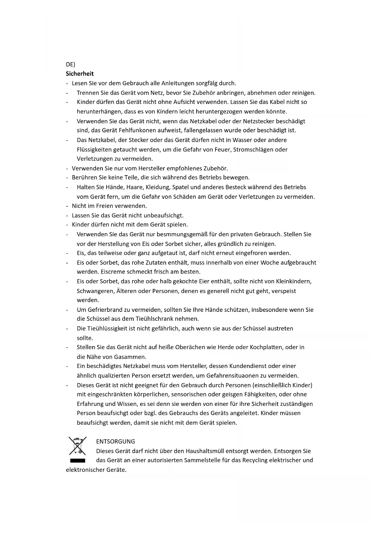 - Verwenden Sie das Gerät nur besmmungsgemäß für den privaten Gebrauch. Stellen Sie vor der Herstellung von Eis oder Sorbet sicher, alles gründlich zu reinigen.