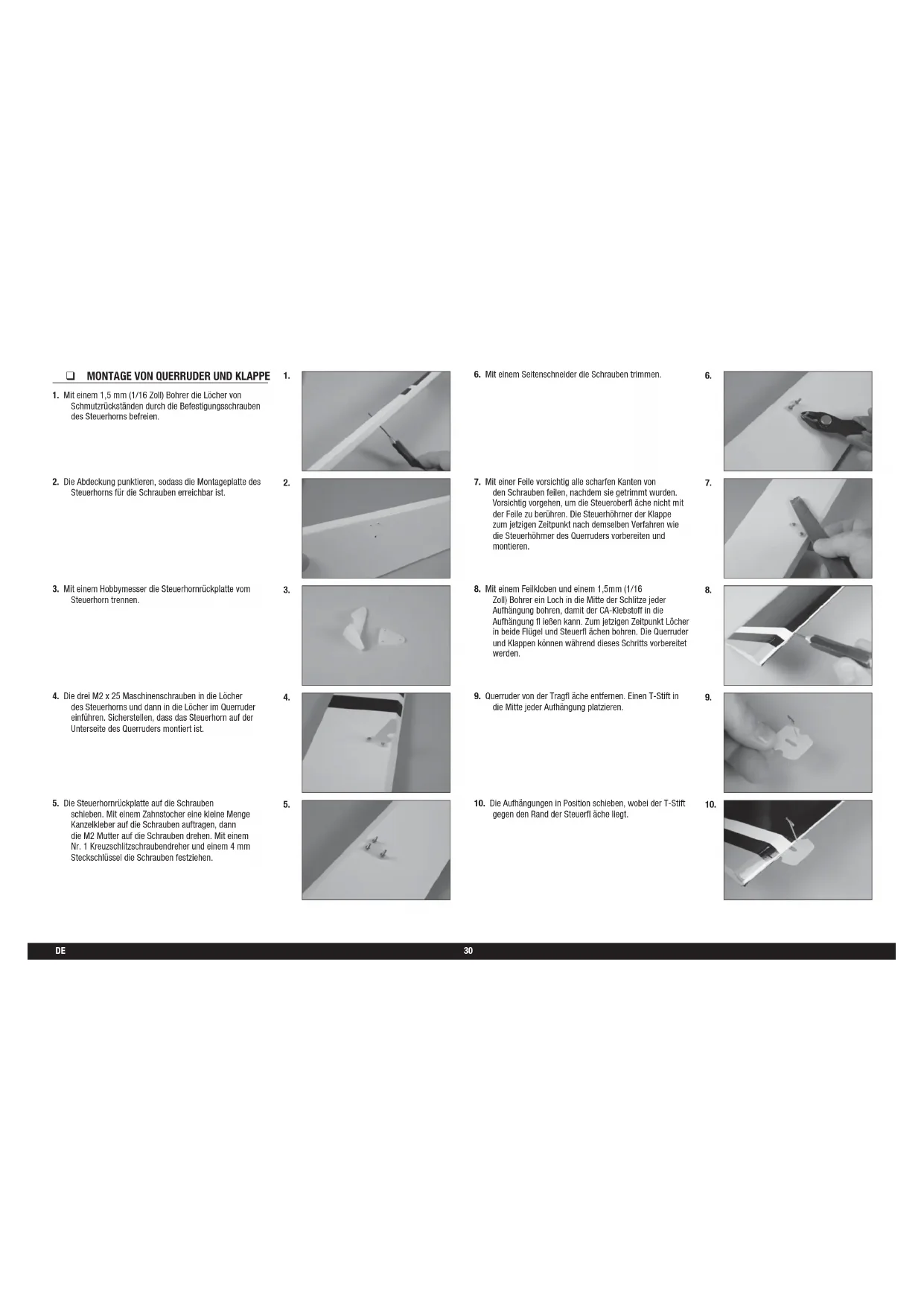 Zoll) Bohrer ein Loch in die Mitte der Schlitze jeder Aufhängung bohren, damit der CA-Klebstoff in die Aufhängung fl ießen kann. Zum jetzigen Zeitpunkt Löcher in beide Flügel und Steuerfl ächen bohren. Die Querruder und Klappen können während dieses Schritts vorbereitet werden.