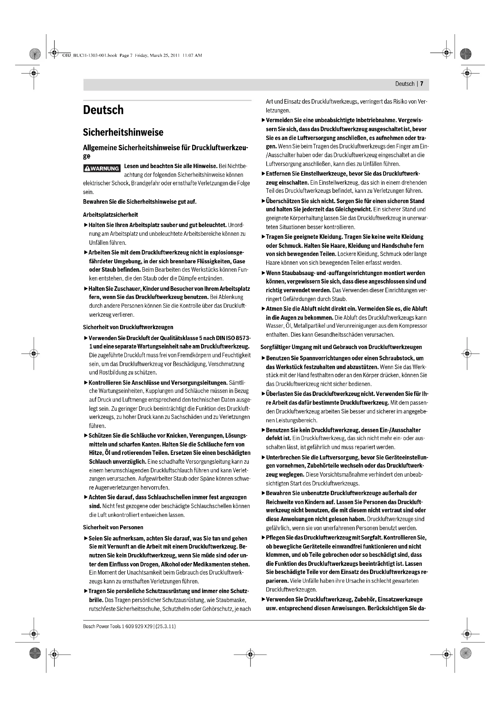 Lesen und beachten Sie alle Hinweise. Bei Nichtbe- achtung der folgenden Sicherheitshinweise können elektrischer Schock, Brandgefahr oder ernsthafte Verletzungen die Folge sein. Bewahren Sie die Sicherheitshinweise gut auf. Arbeitsplatzsicherheit fHalten Sie Ihren Arbeitsplatz sauber und gut beleuchtet. Unord- nung am Arbeitsplatz und unbeleuchtete Arbeitsbereiche können zu Unfällen führen. fArbeiten Sie mit dem Druckluftwerkzeug nicht in explosionsge- fährdeter Umgebung, in der sich brennbare Flüssigkeiten, Gase oder Staub befinden. Beim Bearbeiten des Werkstücks können Fun- ken entstehen, die den Staub oder die Dämpfe entzünden. fHalten Sie Zuschauer, Kinder und Besucher von Ihrem Arbeitsplatz fern, wenn Sie das Druckluftwerkzeug benutzen. Bei Ablenkung durch andere Personen können Sie die Kontrolle über das Druckluft- werkzeug verlieren. Sicherheit von Druckluftwerkzeugen fVerwenden Sie Druckluft der Qualitätsklasse 5 nach DIN ISO 8573- 1 und eine separate Wartungseinheit nahe am Druckluftwerkzeug. Die zugeführte Druckluft muss frei von Fremdkörpern und Feuchtigkeit sein, um das Druckluftwerkzeug vor Beschädigung, Verschmutzung und Rostbildung zu schützen. fKontrollieren Sie Anschlüsse und Versorgungsleitungen. Sämtli- che Wartungseinheiten, Kupplungen und Schläuche müssen in Bezug auf Druck und Luftmenge entsprechend den technischen Daten ausge- legt sein. Zu geringer Druck beeinträchtigt die Funktion des Druckluft- werkzeugs, zu hoher Druck kann zu Sachschäden und zu Verletzungen führen. fSchützen Sie die Schläuche vor Knicken, Verengungen, Lösungs- mitteln und scharfen Kanten. Halten Sie die Schläuche fern von Hitze, Öl und rotierenden Teilen. Ersetzen Sie einen beschädigten Schlauch unverzüglich. Eine schadhafte Versorgungsleitung kann zu einem herumschlagenden Druckluftschlauch führen und kann Verlet- zungen verursachen. Aufgewirbelter Staub oder Späne können schwe- re Augenverletzungen hervorrufen. fAchten Sie darauf, dass Schlauchschellen immer fest angezogen sind. Nicht fest gezogene oder beschädigte Schlauchschellen können die Luft unkontrolliert entweichen lassen. Sicherheit von Personen fSeien Sie aufmerksam, achten Sie darauf, was Sie tun und gehen Sie mit Vernunft an die Arbeit mit einem Druckluftwerkzeug. Be- nutzen Sie kein Druckluftwerkzeug, wenn Sie müde sind oder un- ter dem Einfluss von Drogen, Alkohol oder Medikamenten stehen. Ein Moment der Unachtsamkeit beim Gebrauch des Druckluftwerk- zeugs kann zu ernsthaften Verletzungen führen. fTragen Sie persönliche Schutzausrüstung und immer eine Schutz- brille. Das Tragen persönlicher Schutzausrüstung, wie Staubmaske, rutschfeste Sicherheitsschuhe, Schutzhelm oder Gehörschutz, je nach Art und Einsatz des Druckluftwerkzeugs, verringert das Risiko von Ver- letzungen. fVermeiden Sie eine unbeabsichtigte Inbetriebnahme. Vergewis- sern Sie sich, dass das Druckluftwerkzeug ausgeschaltet ist, bevor Sie es an die Luftversorgung anschließen, es aufnehmen oder tra- gen. Wenn Sie beim Tragen des Druckluftwerkzeugs den Finger am Ein- /Ausschalter haben oder das Druckluftwerkzeug eingeschaltet an die Luftversorgung anschließen, kann dies zu Unfällen führen. fEntfernen Sie Einstellwerkzeuge, bevor Sie das Druckluftwerk- zeug einschalten. Ein Einstellwerkzeug, das sich in einem drehenden Teil des Druckluftwerkzeugs befindet, kann zu Verletzungen führen. fÜberschätzen Sie sich nicht. Sorgen Sie für einen sicheren Stand und halten Sie jederzeit das Gleichgewicht. Ein sicherer Stand und geeignete Körperhaltung lassen Sie das Druckluftwerkzeug in unerwar- teten Situationen besser kontrollieren. fTragen Sie geeignete Kleidung. Tragen Sie keine weite Kleidung oder Schmuck. Halten Sie Haare, Kleidung und Handschuhe fern von sich bewegenden Teilen. Lockere Kleidung, Schmuck oder lange Haare können von sich bewegenden Teilen erfasst werden. fWenn Staubabsaug- und -auffangeinrichtungen montiert werden können, vergewissern Sie sich, dass diese angeschlossen sind und richtig verwendet werden. Das Verwenden dieser Einrichtungen ver- ringert Gefährdungen durch Staub. fAtmen Sie die Abluft nicht direkt ein. Vermeiden Sie es, die Abluft in die Augen zu bekommen. Die Abluft des Druckluftwerkzeugs kann Wasser, Öl, Metallpartikel und Verunreinigungen aus dem Kompressor enthalten. Dies kann Gesundheitsschäden verursachen. Sorgfältiger Umgang mit und Gebrauch von Druckluftwerkzeugen fBenutzen Sie Spannvorrichtungen oder einen Schraubstock, um das Werkstück festzuhalten und abzustützen. Wenn Sie das Werk- stück mit der Hand festhalten oder an den Körper drücken, können Sie das Druckluftwerkzeug nicht sicher bedienen. fÜberlasten Sie das Druckluftwerkzeug nicht. Verwenden Sie für Ih- re Arbeit das dafür bestimmte Druckluftwerkzeug. Mit dem passen- den Druckluftwerkzeug arbeiten Sie besser und sicherer im angegebe- nen Leistungsbereich. fBenutzen Sie kein Druckluftwerkzeug, dessen Ein-/Ausschalter defekt ist. Ein Druckluftwerkzeug, das sich nicht mehr ein- oder aus- schalten lässt, ist gefährlich und muss repariert werden. fUnterbrechen Sie die Luftversorgung, bevor Sie Geräteeinstellun- gen vornehmen, Zubehörteile wechseln oder das Druckluftwerk- zeug weglegen. Diese Vorsichtsmaßnahme verhindert den unbeab- sichtigten Start des Druckluftwerkzeugs. fBewahren Sie unbenutzte Druckluftwerkzeuge außerhalb der Reichweite von Kindern auf. Lassen Sie Personen das Druckluft- werkzeug nicht benutzen, die mit diesem nicht vertraut sind oder diese Anweisungen nicht gelesen haben. Druckluftwerkzeuge sind gefährlich, wenn sie von unerfahrenen Personen benutzt werden. fPflegen Sie das Druckluftwerkzeug mit Sorgfalt. Kontrollieren Sie, ob bewegliche Geräteteile einwandfrei funktionieren und nicht klemmen, und ob Teile gebrochen oder so beschädigt sind, dass die Funktion des Druckluftwerkzeugs beeinträchtigt ist. Lassen Sie beschädigte Teile vor dem Einsatz des Druckluftwerkzeugs re- parieren. Viele