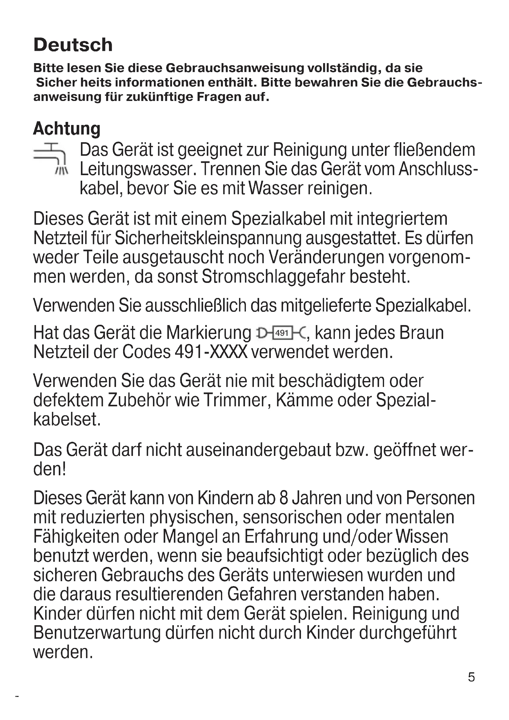 90640279_BT_3242_3241_3240_3940_MN_ANZ.indd 490640279_BT_3242_3241_3240_3940_MN_ANZ.indd 4 15.05.19 10:2615.05.19 10:26 Business Use - P&G AUTHORIZED POA-00132899 Rev 001 Effective Date 2019-05-23 Printed 2020-10-06 Page 4 of 525 Deutsch Bitte lesen Sie diese Gebrauchsanweisung vollständig, da sie Sicher heits informationen enthält. Bitte bewahren Sie die Gebrauchs- anweisung für zukünftige Fragen auf. Achtung Das Gerät ist geeignet zur Reinigung unter fließendem Leitungswasser. Trennen Sie das Gerät vom Anschluss- kabel, bevor Sie es mit Wasser reinigen. Dieses Gerät ist mit einem Spezialkabel mit integriertem Netzteil für Sicherheitskleinspannung ausgestattet. Es dürfen weder Teile ausgetauscht noch Veränderungen vorgenom- men werden, da sonst Stromschlaggefahr besteht. Verwenden Sie ausschließlich das mitgelieferte Spezialkabel. Hat das Gerät die Markierung