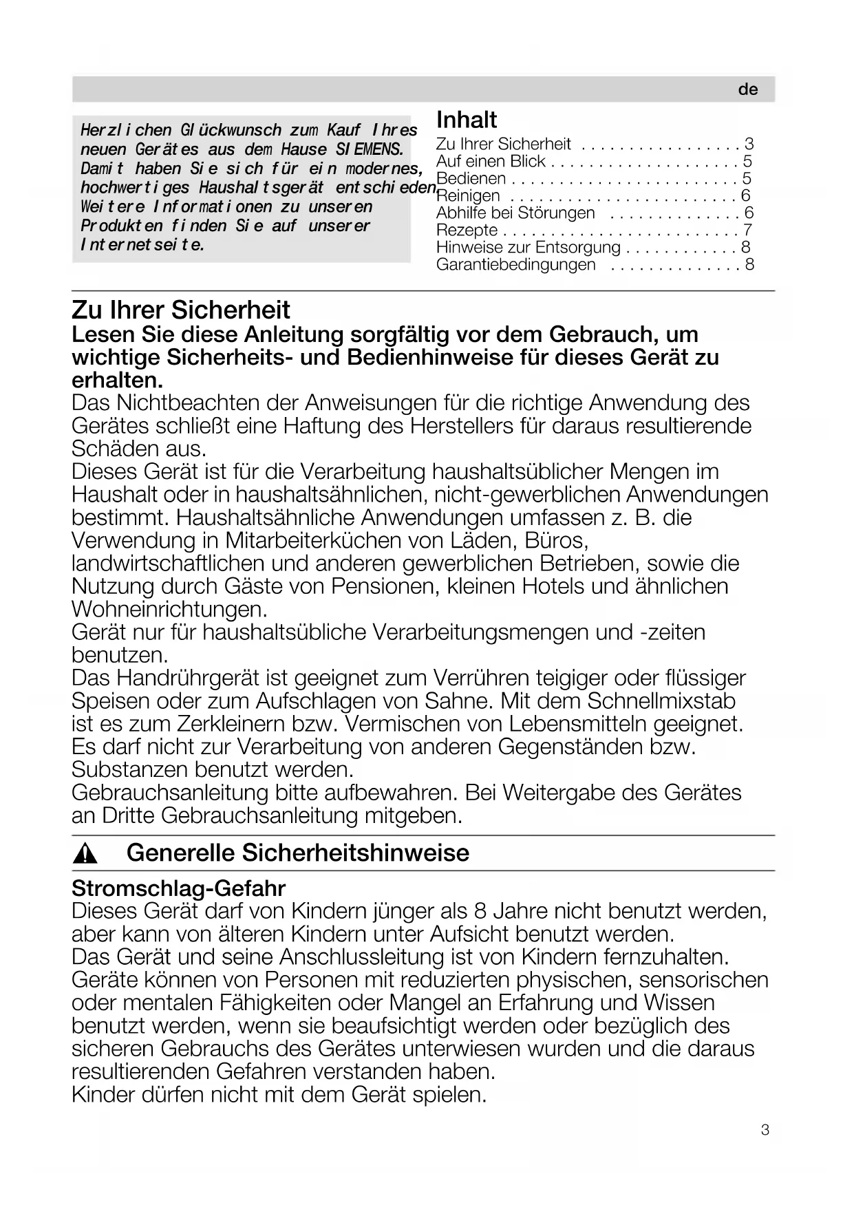 - Garantiebedingungen Zu Ihrer Sicherheit Lesen Sie diese Anleitung sorgfältig vor dem Gebrauch, um wichtige Sicherheits- und Bedienhinweise für dieses Gerät zu erhalten. Das Nichtbeachten der Anweisungen für die richtige Anwendung des Gerätes schließt eine Haftung des Herstellers für daraus resultierende Schäden aus. Dieses Gerät ist für die Verarbeitung haushaltsüblicher Mengen im Haushalt oder in haushaltsähnlichen, nicht-gewerblichen Anwendungen bestimmt. Haushaltsähnliche Anwendungen umfassen z. B. die Verwendung in Mitarbeiterküchen von Läden, Büros, landwirtschaftlichen und anderen gewerblichen Betrieben, sowie die Nutzung durch Gäste von Pensionen, kleinen Hotels und ähnlichen Wohneinrichtungen. Gerät nur für haushaltsübliche Verarbeitungsmengen und -zeiten benutzen. Das Handrührgerät ist geeignet zum Verrühren teigiger oder flüssiger Speisen oder zum Aufschlagen von Sahne. Mit dem Schnellmixstab ist es zum Zerkleinern bzw. Vermischen von Lebensmitteln geeignet. Es darf nicht zur Verarbeitung von anderen Gegenständen bzw. Substanzen benutzt werden. Gebrauchsanleitung bitte aufbewahren. Bei Weitergabe des Gerätes an Dritte Gebrauchsanleitung mitgeben. , Generelle Sicherheitshinweise Stromschlag-Gefahr Dieses Gerät darf von Kindern jünger als 8 Jahre nicht benutzt werden, aber kann von älteren Kindern unter Aufsicht benutzt werden. Das Gerät und seine Anschlussleitung ist von Kindern fernzuhalten. Geräte können von Personen mit reduzierten physischen, sensorischen oder mentalen Fähigkeiten oder Mangel an Erfahrung und Wissen benutzt werden, wenn sie beaufsichtigt werden oder bezüglich des sicheren Gebrauchs des Gerätes unterwiesen wurden und die daraus resultierenden Gefahren verstanden haben. Kinder dürfen nicht mit dem Gerät spielen. p. 8